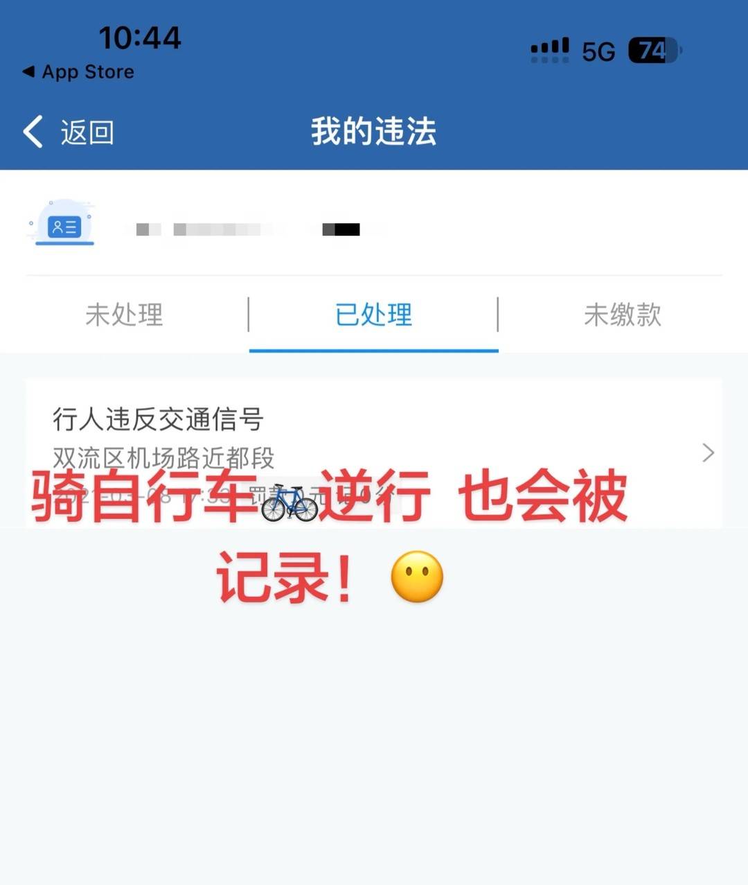 近日,有网友称,他在成都双流区机场路近都段骑自行车逆行被抓,在“交管12123”App上还能查到记录。对于这段经历,在评论区引发了不少网友讨论。
