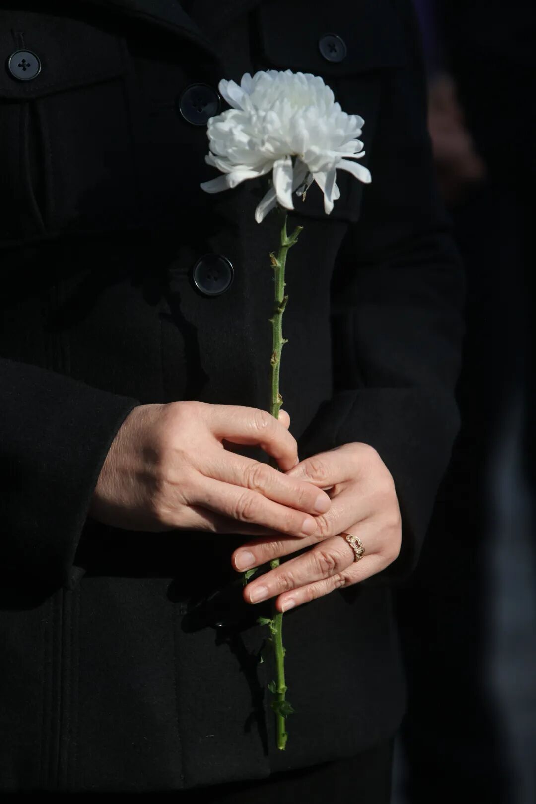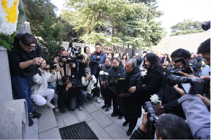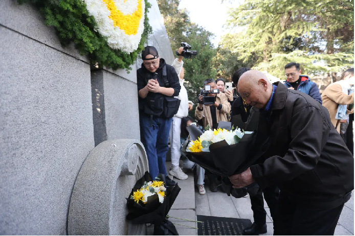 96岁的夏淑琴在外孙女、首批南京大屠杀历史记忆传承人夏媛等人的搀扶下,缓步走到墙前。她凝视着墙上亲人的名字,沉默良久,而后深深鞠躬。那双布满皱纹、微微颤抖的手,将一束黄白相间的菊花,郑重地献于墙下,嘴里念叨着:“88年了,88年了……”