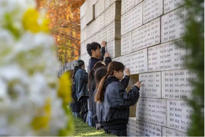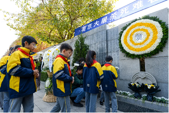 青灰色石墙上高悬着青松枝叶,黄白菊花组成庄严的“奠”字花环,密密麻麻的名字无声诉说着历史的伤痛。