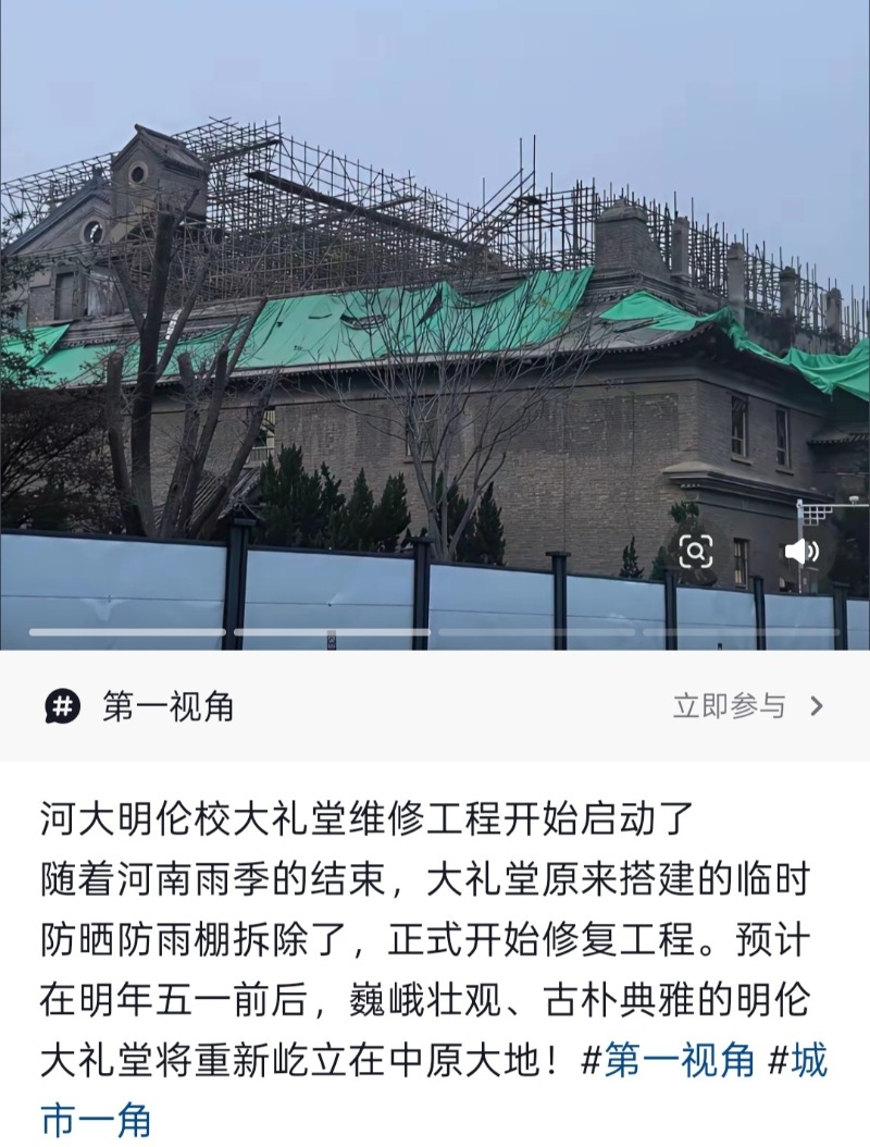 河南大学大礼堂失火后修缮进程引关注,网民发帖称已动工
