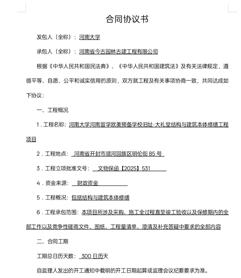 公开的《合同协议书》显示,发包人为河南大学,承包人为河南省今古园林古建工程有限公司,签约合同价为20563930.21 元,资金来源为财政资金。合同于8月25日签订。