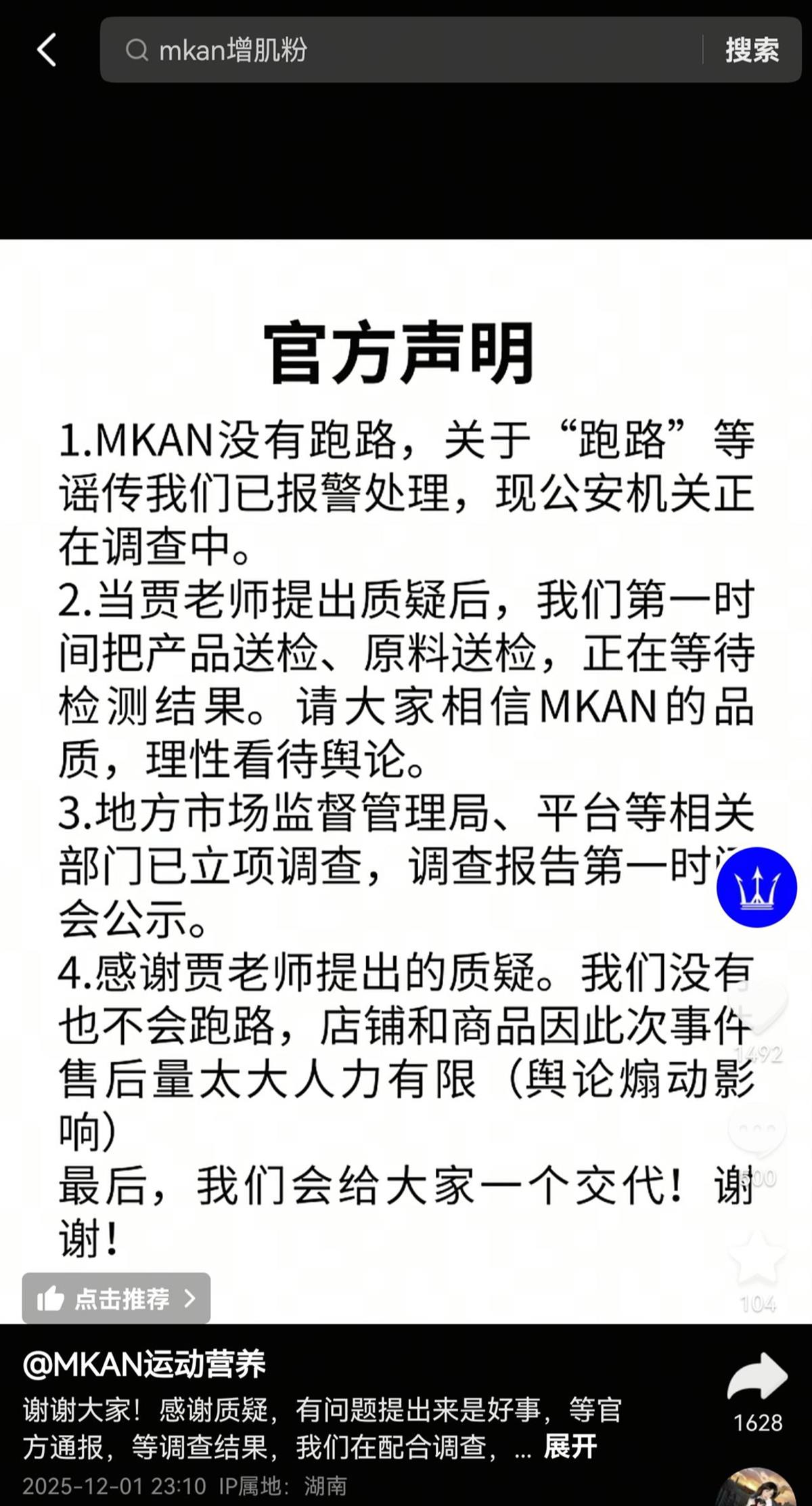 12月4日,记者在MKAN运动营养旗舰店看到,商品已经下架,看不到相关产品信息。该店铺营业执照显示,企业名为江西海康健康产业有限公司,注册资金200万元,店铺销量15.2万。MKAN运动营养12月1日曾在抖音账号上发布官方声明:MKAN没有跑路,当贾先生质疑后,第一时间把产品送检、原料送检,正在等待检测结果,请大家相信MKAN的品质,理性看待舆论;地方市场监督管理局、平台等相关部门已立项调查,调查报告第一时间会公示。
