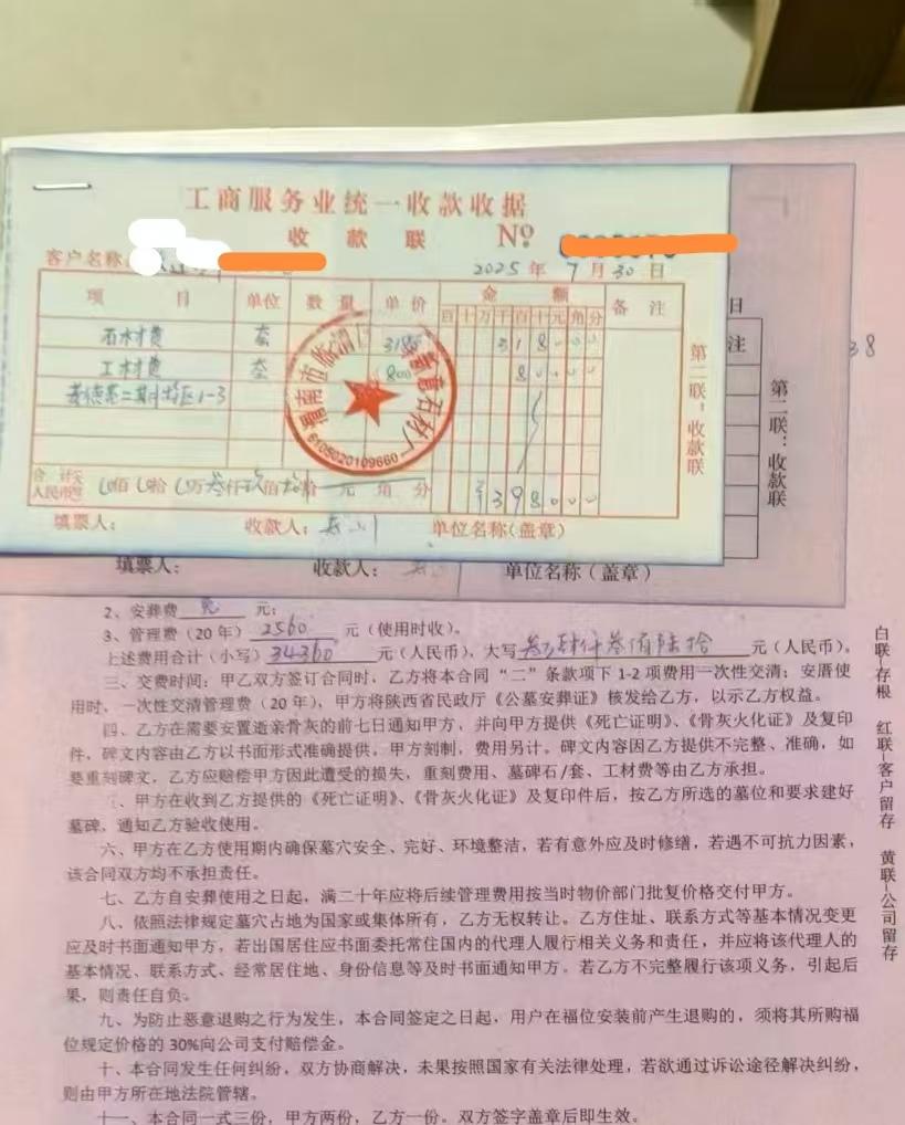 家人前往渭南临渭区龙寿山生态公墓精心挑选了两个相邻的墓位,当时以每个墓位费用包括石材费、工材费、刻字费及20年服务费共计34360元。他们以这个价位购买两个相邻的墓位,一共支付了近7万元。