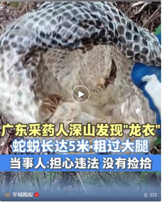 据深圳卫视报道,12月2日,广东阳江一位采药人在山间发现一条长约5米的巨型蛇蜕。