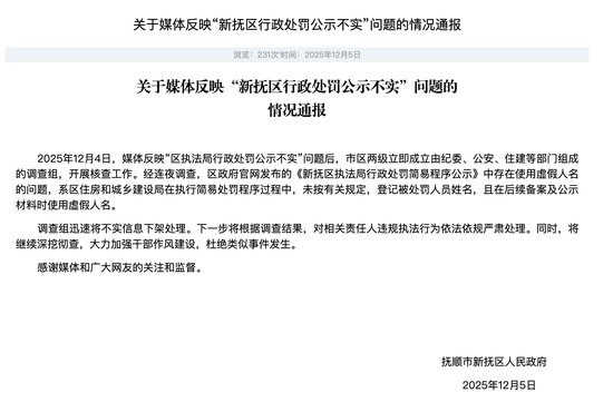 12月5日,抚顺市新抚区人民政府发布情况通报称,12月4日,媒体反映“区执法局行政处罚公示不实”问题后,市区两级立即成立由纪委、公安、住建等部门组成的调查组,开展核查工作。经连夜调查,区政府官网发布的《新抚区执法局行政处罚简易程序公示》中存在使用虚假人名的问题,系区住房和城乡建设局在执行简易处罚程序过程中,未按有关规定,登记被处罚人员姓名,且在后续备案及公示材料时使用虚假人名。调查组迅速将不实信息下架处理。下一步将根据调查结果,对相关责任人违规执法行为依法依规严肃处理。同时,将继续深挖彻查,大力加强干部作风建设,杜绝类似事件发生。
