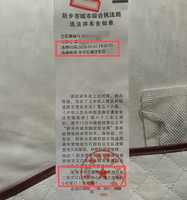 时先生55岁,河南新乡人,据他回忆,2025年12月2日下午约2点30分,他因心脏不适,将车停放在新乡市高新区丰华街与午阳路交叉口北侧的停车位内,随后在副驾驶位睡着。大约下午3点07分,他醒来下车时,发现驾驶室车窗上已被贴上了《违法停车告知单》,落款单位为新乡市城市综合执法局。