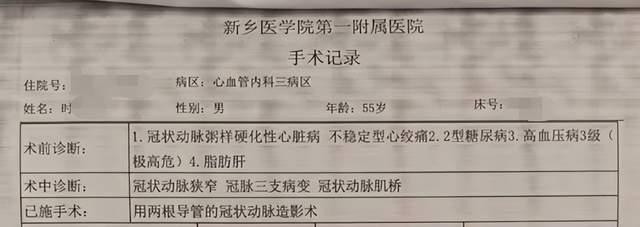 12月4日,时先生向记者提供了他的手术报告和收到的《违法停车告知单》,由新乡医学院第一附属医院出具的手术记录显示,今年5月21日,他因冠状动脉粥样硬化性心脏病、不稳定型心绞痛、冠状动脉狭窄、冠脉三支病变、冠状动脉肌桥等多种心脏病因,接受了两根导管的冠状动脉造影术。