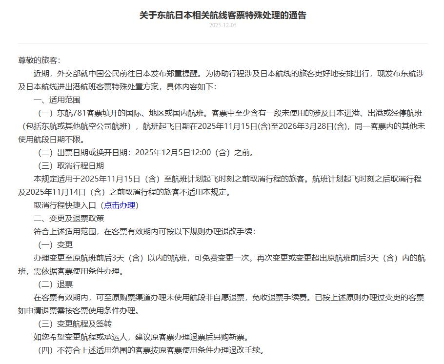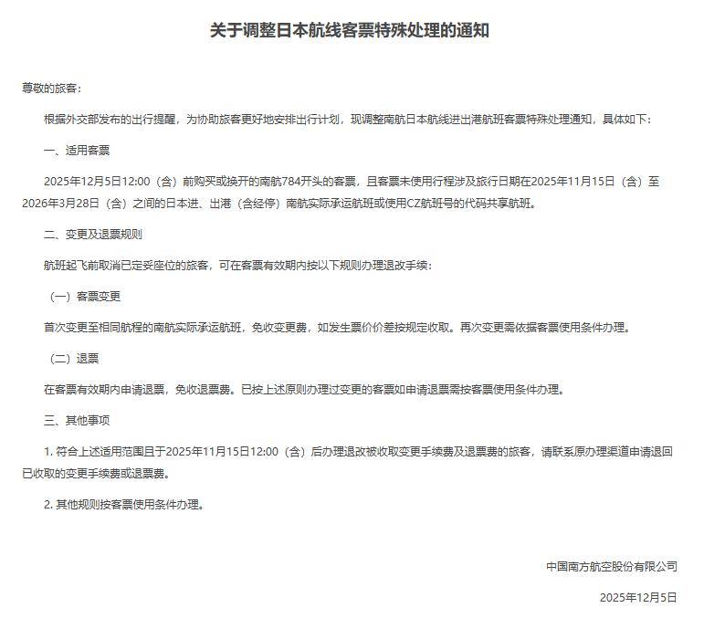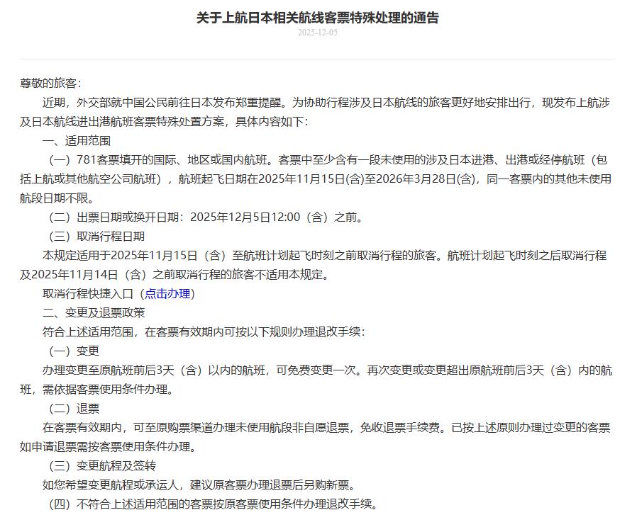 针对2025年12月5日12:00(含)前购买或换开的相关客票,且客票未使用行程涉及旅行日期在2025年11月15日(含)至2026年3月28日(含)之间的日本进、出港(含经停)航班或代码共享航班。可免费退改签。