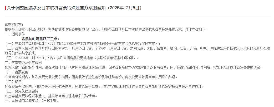今天,国航、东航、南航等航司再次发布关于调整国航涉及日本航线客票特殊处置方案的通知: