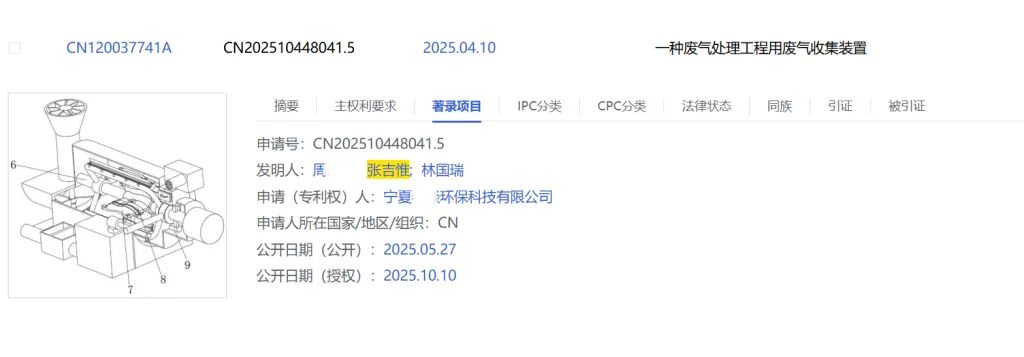 例如,在国家知识产权局网站公布的信息中,“一种废气处理工程用废气收集装置”的申请(专利权)人为宁夏某环保科技有限公司,发明人为周某某; 张吉惟; 林国瑞。