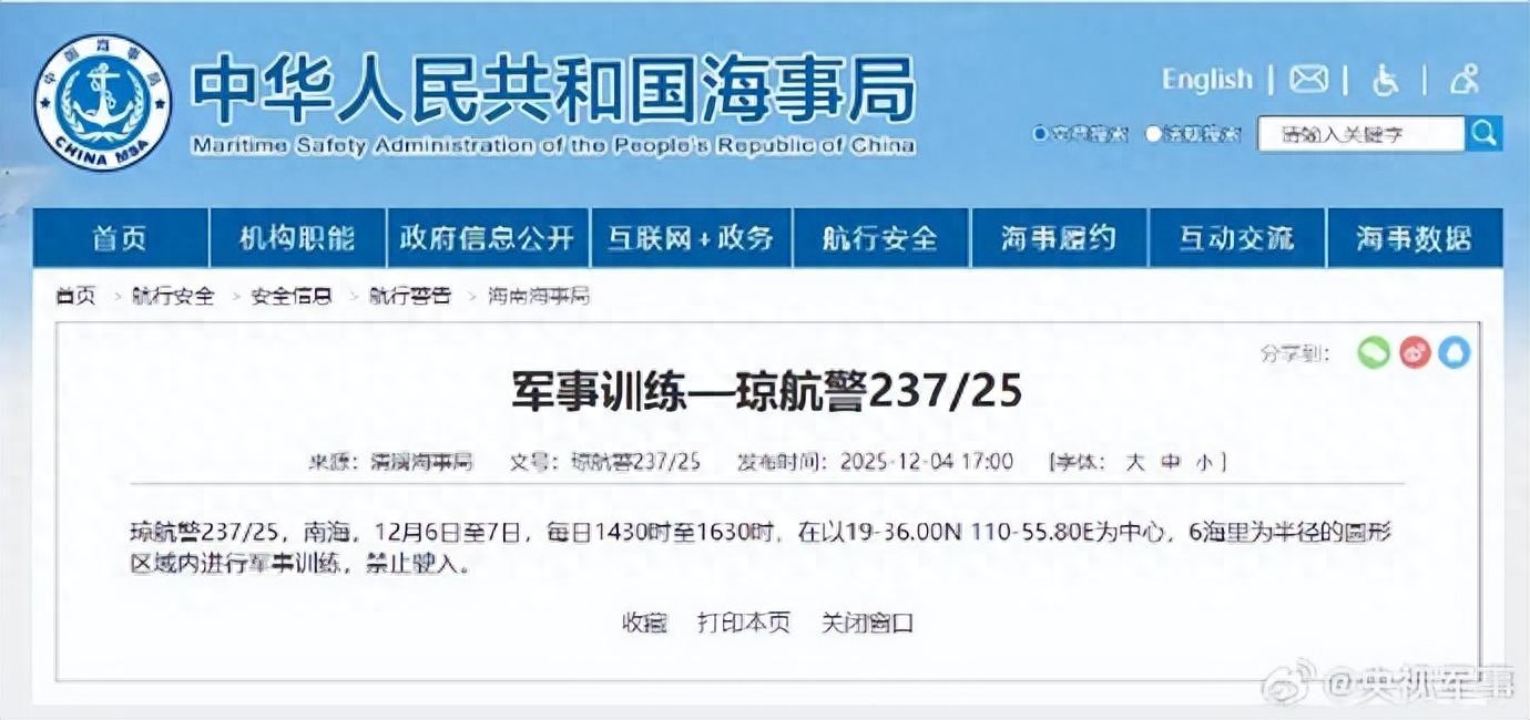 据中国海事局网站消息,清澜海事局发布航行警告,12月6日至7日,每日14时30分至16时30分,南海部分海域进行军事训练,禁止驶入。