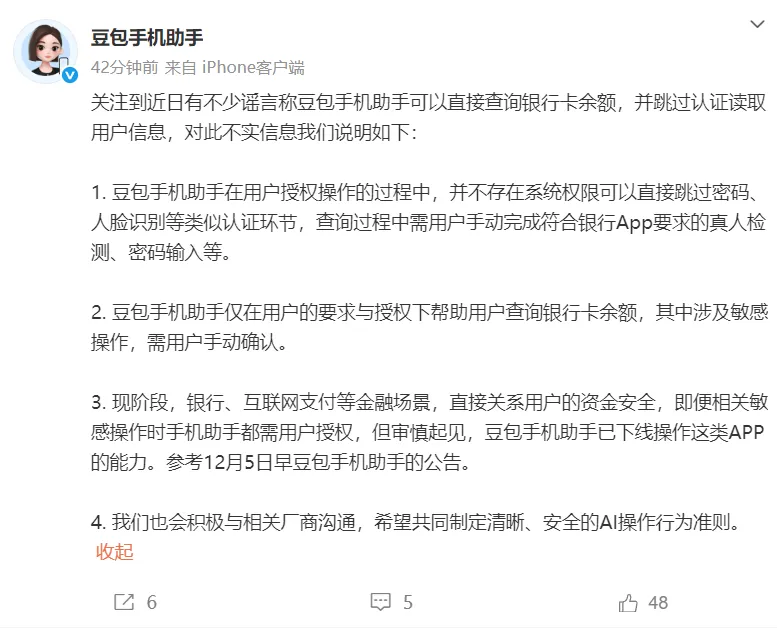 12月6日,豆包手机助手微博发布辟谣称,网传“豆包手机助手可以直接查询银行卡余额,并跳过认证读取用户信息”为谣言。