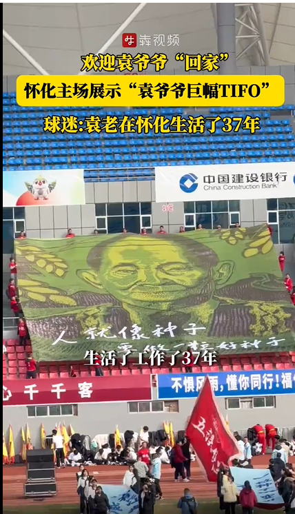 在备受关注的收官战中,怀化队主场对阵邵阳队的比赛开始前,现场呈现了感人一幕:怀化球迷助威看台团缓缓展开了一幅巨型的TIFO(覆盖看台的大型横幅或拼图),上面印有袁隆平院士的画像以及他的生前寄语——“人就像种子,要做一粒好种子”。