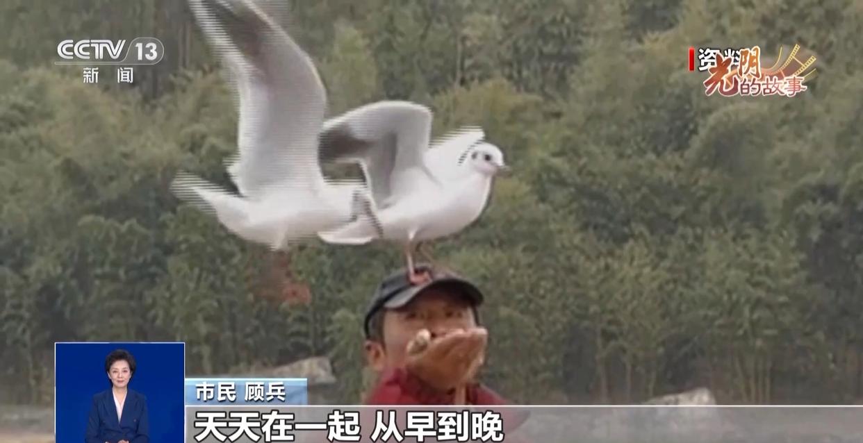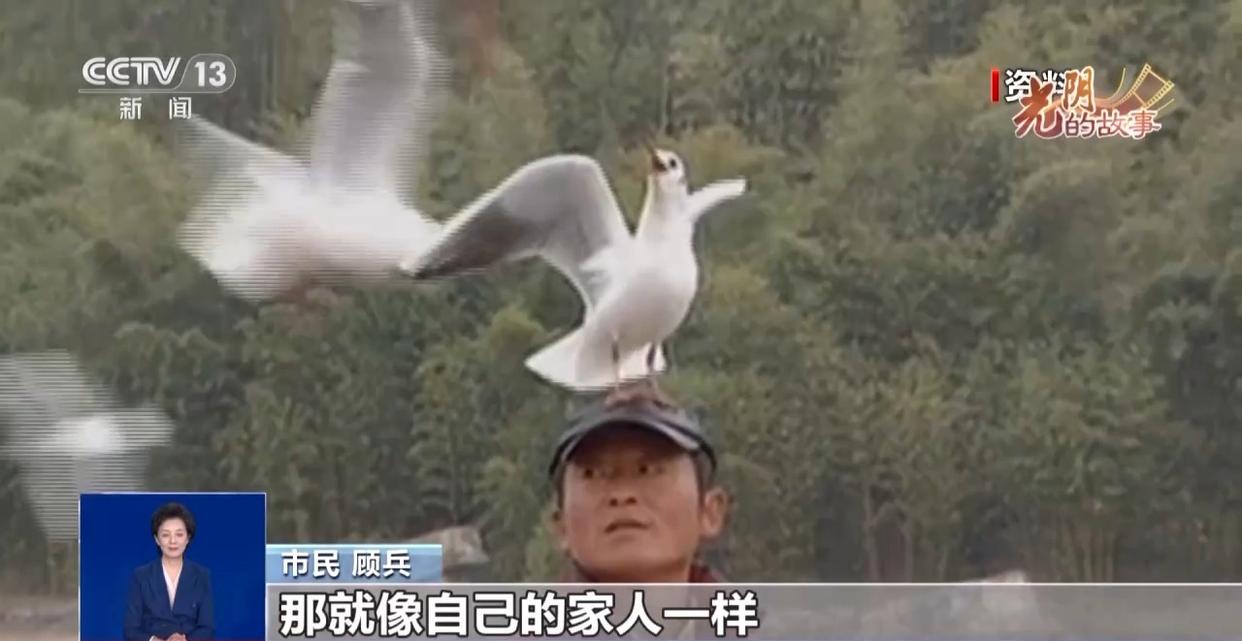 市民 顾兵:我们就慢慢地投食、喂食,每天就看那个天空有没有飞鸟过,来一只就拼命叫“哦哦哦”。一开始下来一只、两只、三只,慢慢就多了。那时候我就知道海鸥它要吃鱼,然后给它买的是小白鱼,远距离、中距离、近距离,慢慢海鸥就多了。