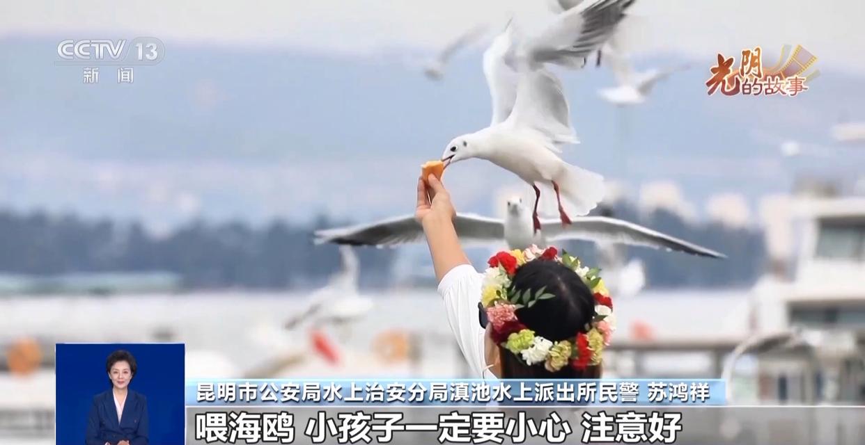 昆明市公安局水上治安分局滇池水上派出所民警 苏鸿祥:喂海鸥,小孩子一定要小心,注意好,大人要扶好、拉好,不要抓海鸥,或者说是为了照相把海鸥搞受伤那种不好。