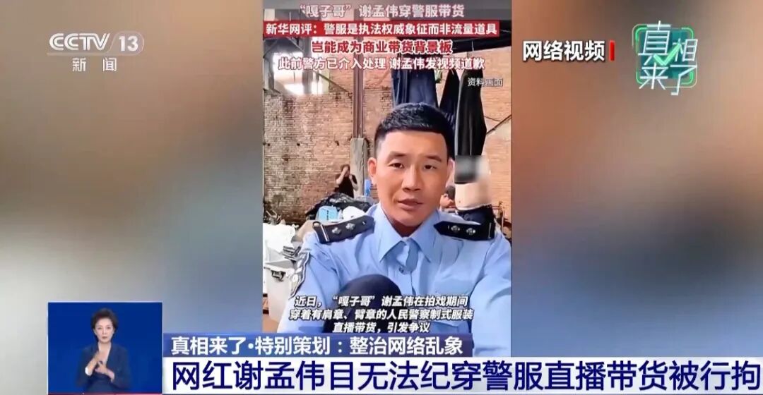 在流量与利益的诱惑交织下,部分网红迷失了方向,甚至不惜踩踏法律红线。“网红”谢孟伟曾是童星出道,今年9月,他身着人民警察制式服装在直播间卖货,不仅目无法纪,还口出狂言,在网友举报后,被云南警方行政拘留7天。