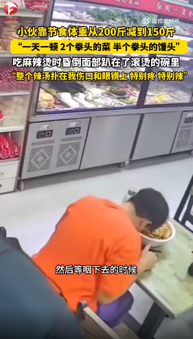 近日,内蒙古包头开理发店的小伙武先生靠节食9个月减肥50斤,从200斤减到150斤。没想到在吃麻辣烫的时候突然昏倒,脸趴在了滚烫的碗里,“整个辣汤扑在我伤口和眼镜上,特别疼,特别辣。”由于有眼镜挡住,武先生的眼睛没有大碍,皮肤浅二度烫伤。