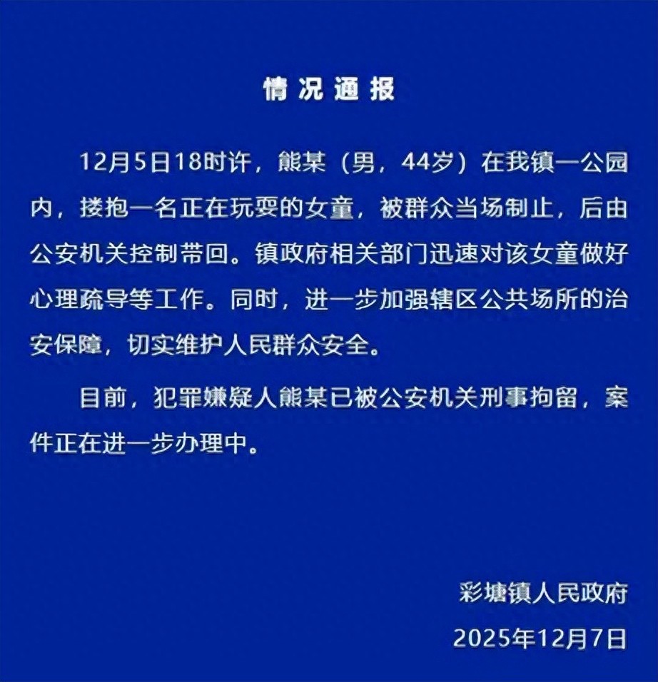 据12月7日广东省潮州市潮安区融媒中心消息:彩塘镇人民政府发布情况通报:12月5日18时许,熊某(男,44岁)在我镇一公园内,搂抱一名正在玩耍的女童,被群众当场制止,后由公安机关控制带回。镇政府相关部门迅速对该女童做好心理疏导等工作。同时,进一步加强辖区公共场所的治安保障,切实维护人民群众安全。