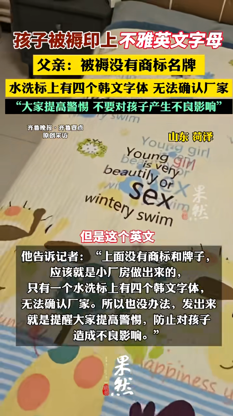 12月6日,一位网友发布视频称自家孩子的婴儿被褥出现不雅英文单词。