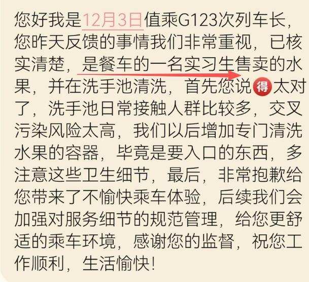 据徐女士提供的短信截图,对方回应:您好我是12月3日值乘G123次列车的列车长,您昨天反馈的事情我们非常重视,已核实清楚,是餐车的一名实习生售卖的水果,并在洗手池清洗,首先您说得太对了,洗手池日常接触人群比较多,交叉污染风险太高,我们以后会增加专门清洗水果的容器,毕竟是要入口的东西,多注意这些卫生细节,最后,非常抱歉给您带来了不愉快乘车体验,后续我们会加强对服务细节的规范管理,给您更舒适的乘车环境,感谢您的监督,祝您工作顺利,生活愉快!