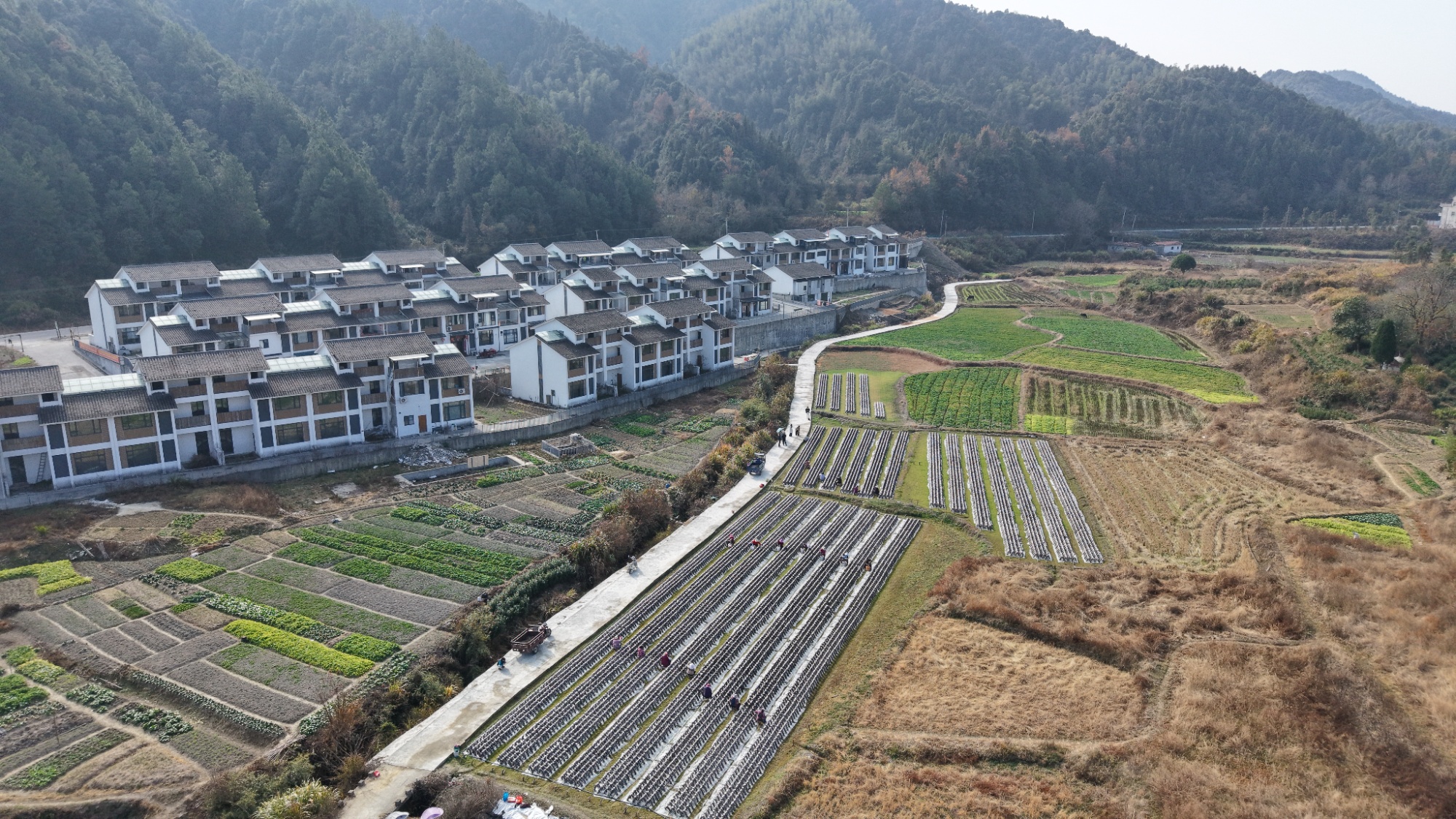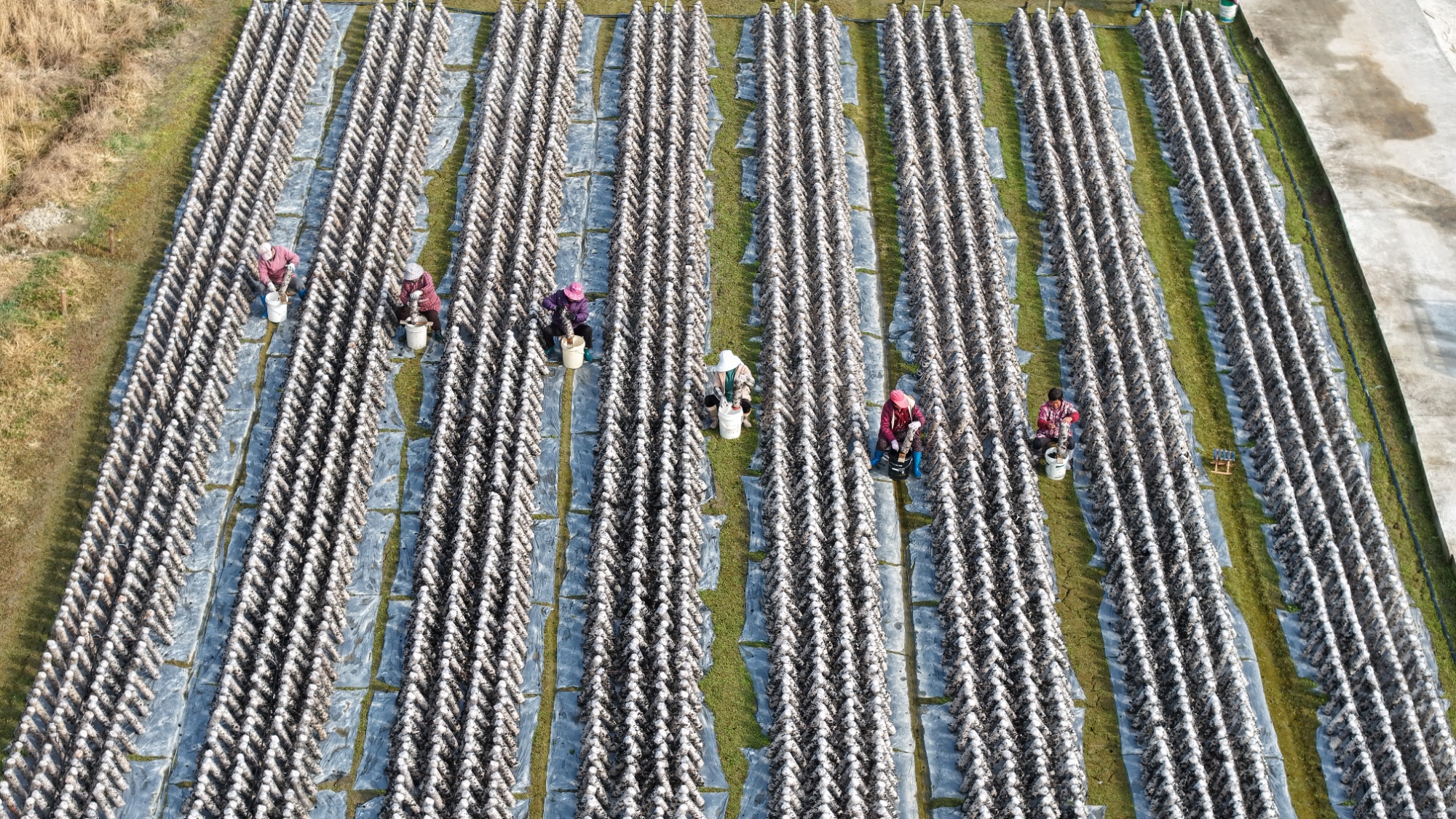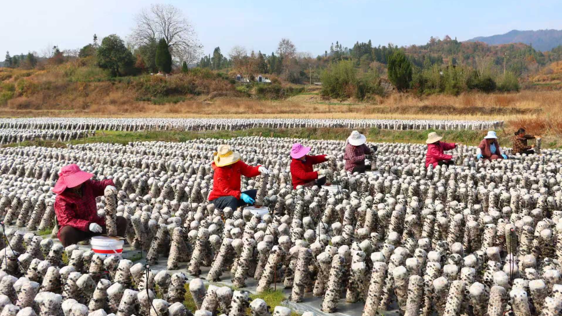桃墅村木耳种植基地里繁忙景象航拍图