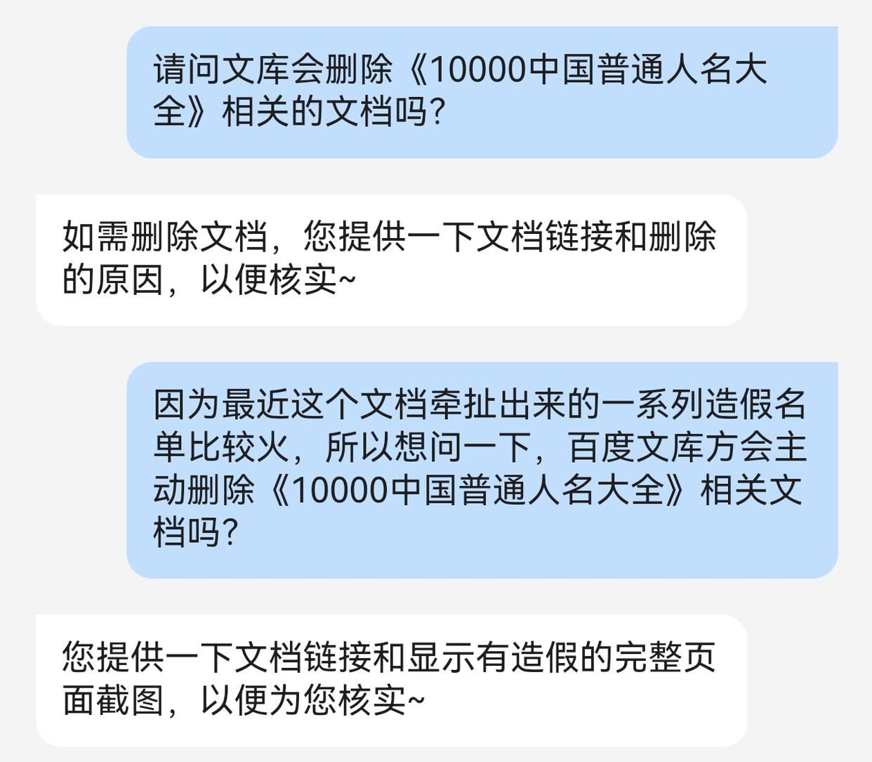 记者随后拨打了百度文库热线,记者询问百度文库方是否会主动下架人名库文档, 客服表示,“客服会进行记录,工作人员会评估是否能够进行下架处理。”