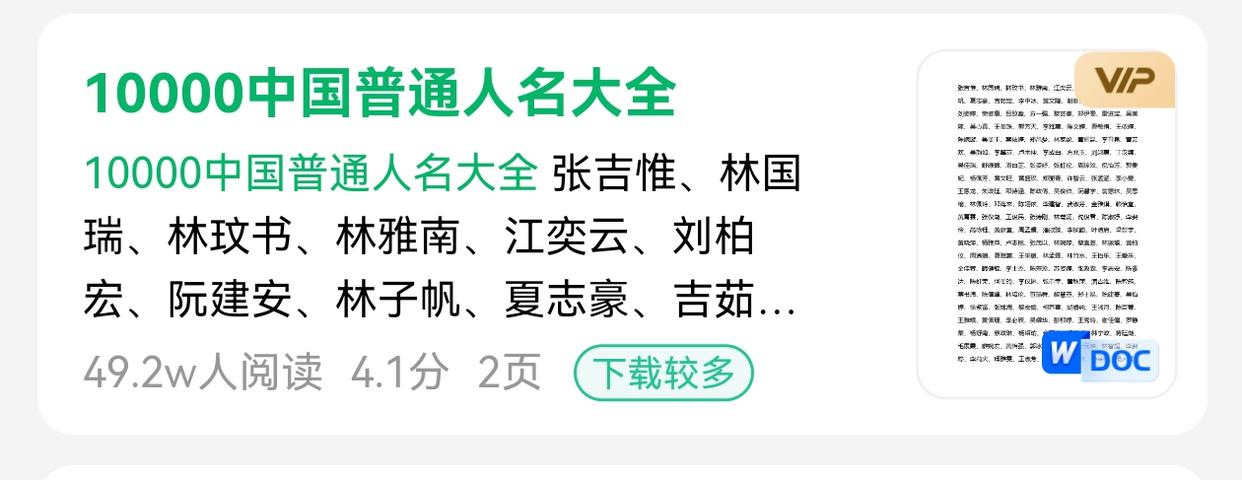 潇湘晨报记者在百度文库APP搜索发现,有10个以上的文档名为《10000中国普通人名大全》,其中被用于名单造假的一份文档,目前已有49.2万人阅读。
