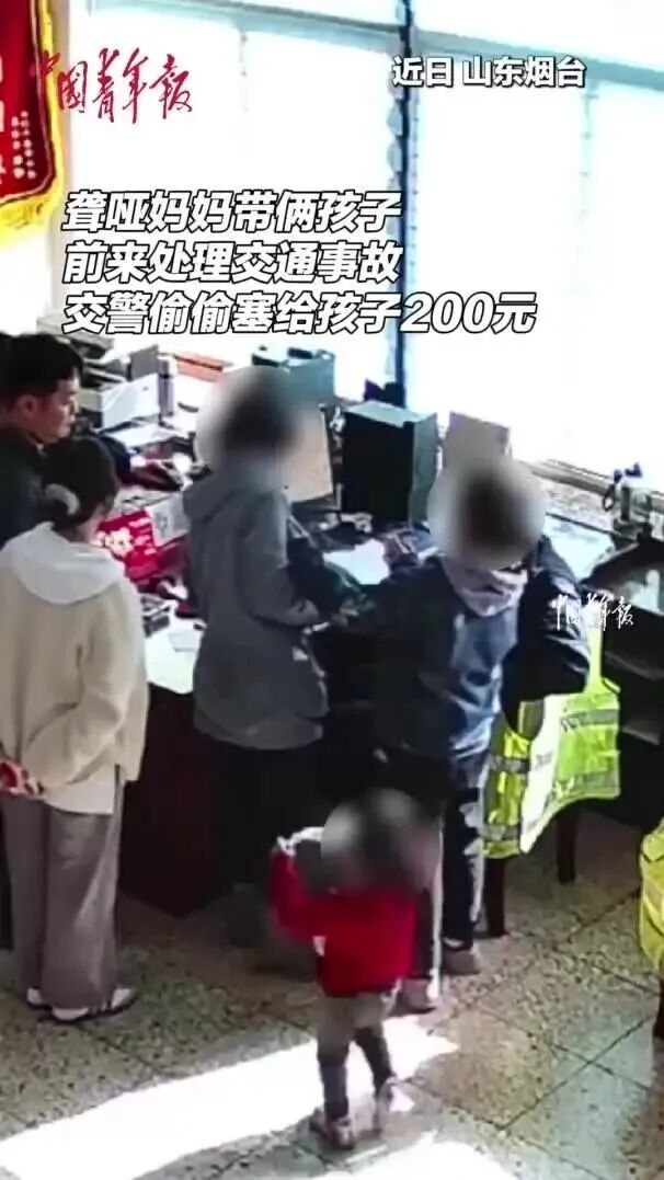 交警王琨处理事故时注意到,聋哑母亲的儿子只穿了一条棉裤,女儿身上的裤子也破了一个洞。他便掏出200块钱,悄悄塞给小姑娘,却被中途“还”了回去。直到第二次硬塞到她衣服兜里,才肯收下。