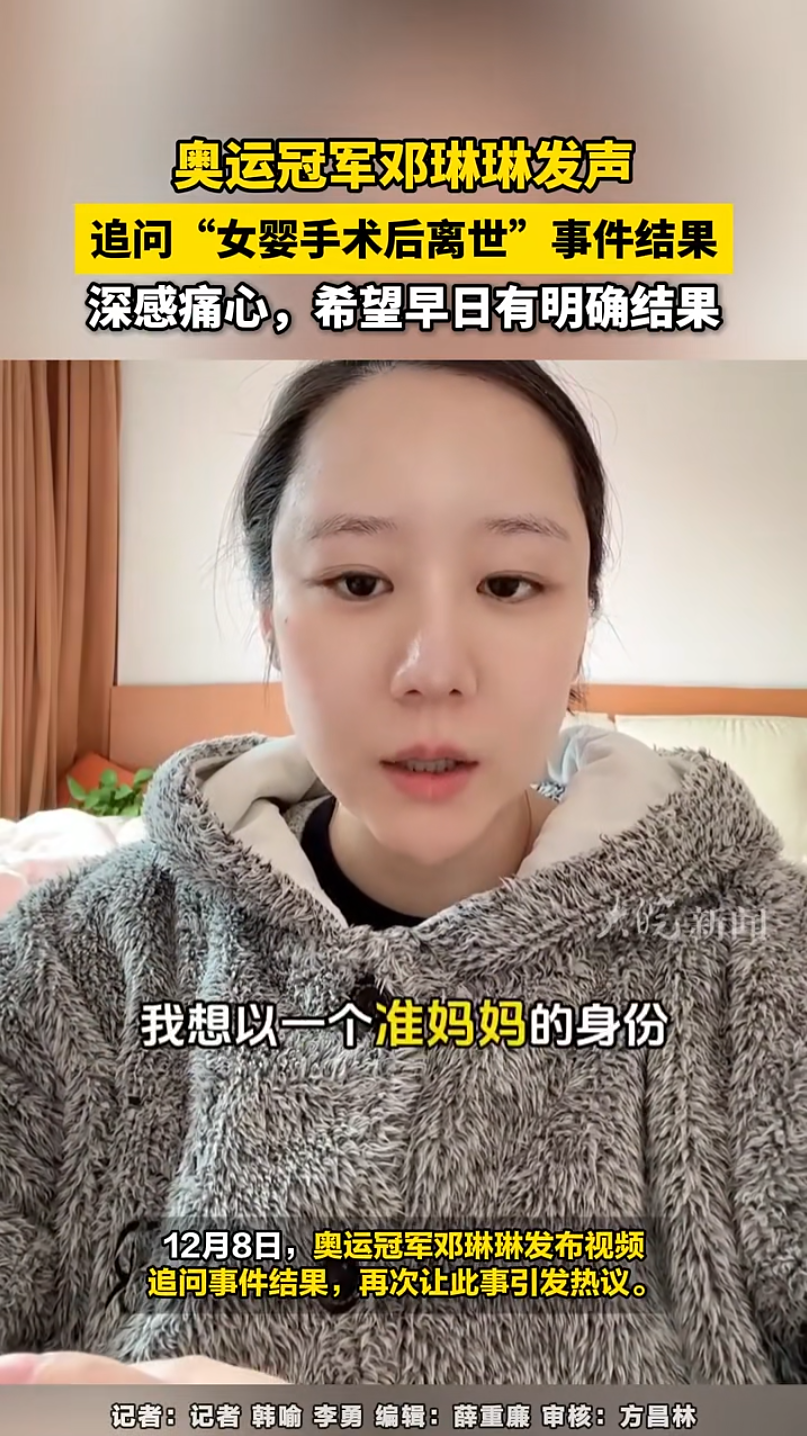 连日来,“5月龄女婴小洛熙心脏手术后离世”事件引发广泛关注。12月8日,奥运冠军邓琳琳发布视频追问事件结果。12月9日,邓琳琳回应大皖新闻记者称,她是准妈妈又与当事人母亲是老乡,对于孩子的不幸离世深感痛心,所以想通过发声引起大家对此事的关注,希望这一事件早日有一个明确的结果。