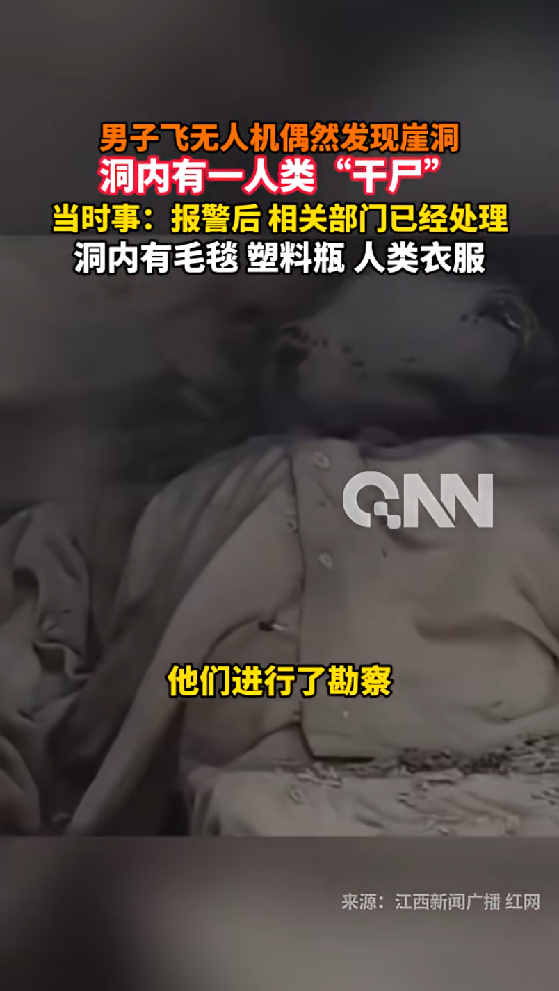 近日,重庆一男子飞无人机时,在一个崖洞中发现干尸。拍摄者当事人:发现干尸后第一时间报警,相关部门赶到现场勘察、处理,也确定的确是一具干尸,是很早之前一个崖洞,里面有塑料瓶子,还有毛毯和人类的衣服。