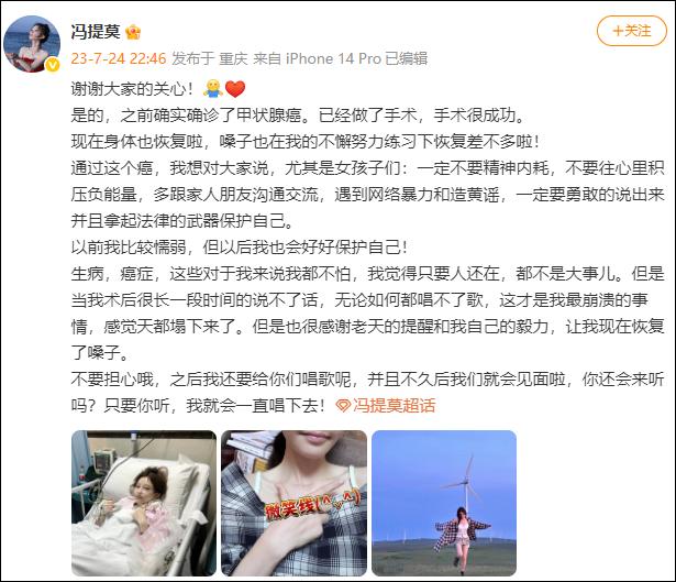 2023年7月,她发文透露确诊甲状腺癌,已完成手术,表示嗓子恢复得差不多。“通过这个癌,我想对大家说,尤其是女孩子们:一定不要精神内耗,不要往心里积压负能量,多跟家人朋友沟通交流,遇到网络暴力和造黄谣,一定要勇敢说出来并且拿起法律的武器保护自己。不要担心哦,之后我还要给你们唱歌呢,并且不久后我们就会见面啦,你还会来听吗?只要你听,我就会一直唱下去!”