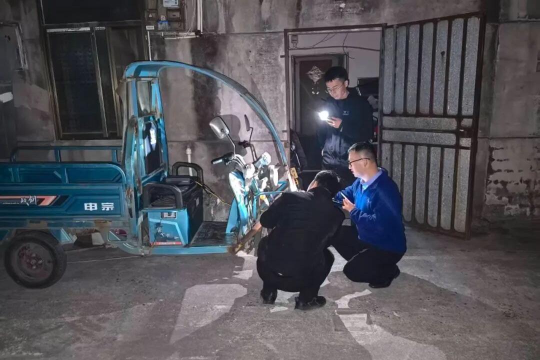此时已至深夜,民警吴永春毅然带领两名队员前往该村开展隐蔽摸排。冬夜寒风凛冽,队员们打着手电,在小区内展开搜索,不放过任何一处可疑角落,最终在一栋楼道旁发现一辆正在充电的电动三轮车。经初步比对,其外形特征与肇事车辆高度吻合,且车头部位可见新鲜碰撞痕迹。