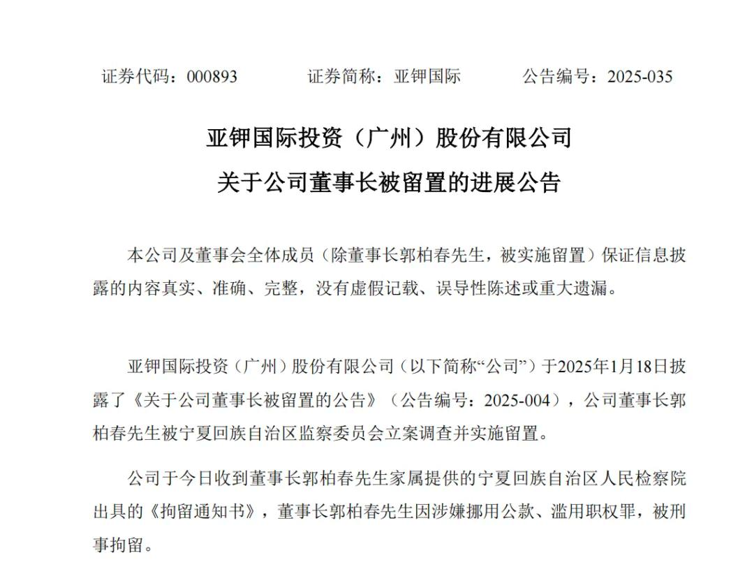 指尖新闻注意到,郭柏春在被立案调查的2024年1月,仍以亚钾国际董事长身份现身老挝生产基地调研并发表讲话,次月还线上主持了公司临时股东大会,其履职状态与涉案调查的时间线存在重叠,这一情况曾引发深交所关注并收到监管问询函。亚钾国际的多份公告还原了相关事件进展:2024年3月,公司披露郭柏春因在银川市副市长任内涉嫌渎职犯罪被留置;2025年1月、7月先后发布进展公告,披露其被立案调查及刑事拘留的消息;2025年8月19日,公司同步公告郭柏春被逮捕的信息,并多次强调相关事项系其个人行为,与公司无关联,公司生产经营正常,控制权未发生变化。此外,天娱数科也同期披露了其董事郭柏春被逮捕的相关公告。