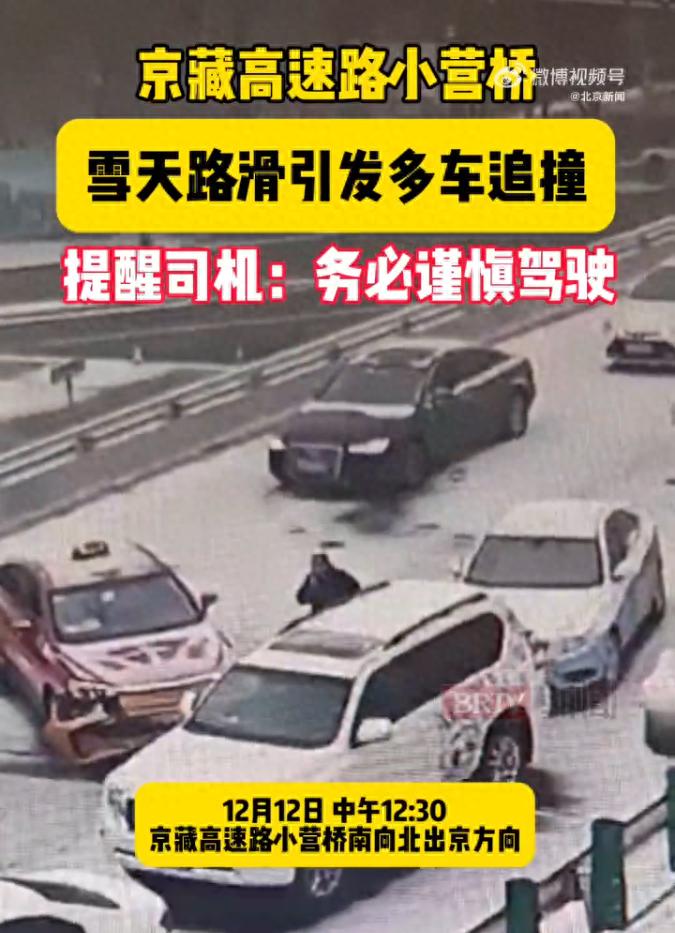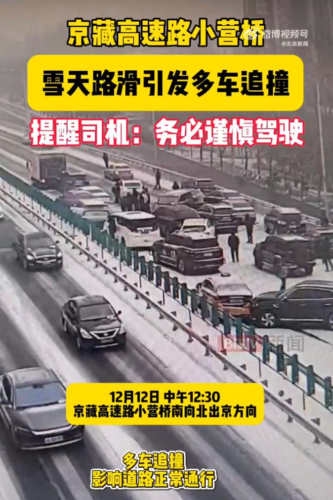 12月12日12:30分左右,京藏高速路小营桥由南向北出京方向,发生多车追撞事故。雪天路滑,提醒大家务必谨慎慢行,注意安全。