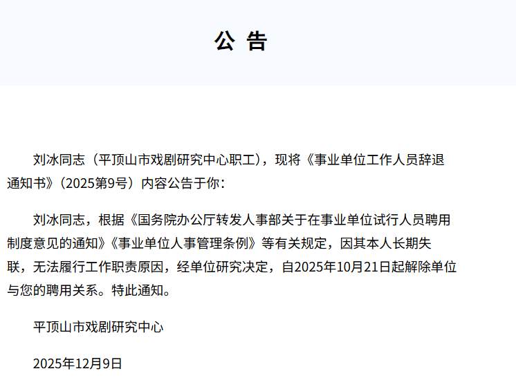被辞退对象为平顶山市戏剧研究中心职工刘冰同志。公告称:刘冰同志,根据《国务院办公厅转发人事部关于在事业单位试行人员聘用制度意见的通知》《事业单位人事管理条例》等有关规定,因其本人长期失联,无法履行工作职责原因,经单位研究决定,自2025年10月21日起解除单位与您的聘用关系。特此通知。
