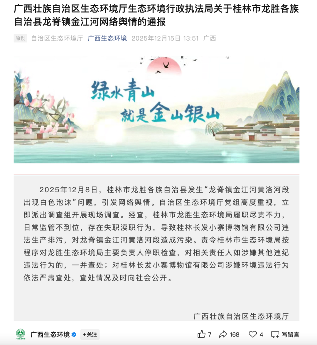 12月8日,桂林市龙胜各族自治县发生“龙脊镇金江河黄洛河段出现白色泡沫”问题,引发网络舆情。自治区生态环境厅党组高度重视,立即派出调查组开展现场调查。经查,桂林市龙胜生态环境局履职尽责不力,日常监管不到位,存在失职渎职行为,导致桂林长发小寨博物馆有限公司违法生产排污,对龙脊镇金江河黄洛河段造成污染。责令桂林市生态环境局按程序对龙胜生态环境局主要负责人停职检查,对相关责任人如涉嫌其他违纪违法行为的,一并查处;对桂林长发小寨博物馆有限公司涉嫌环境违法行为依法严肃查处,查处情况及时向社会公开。