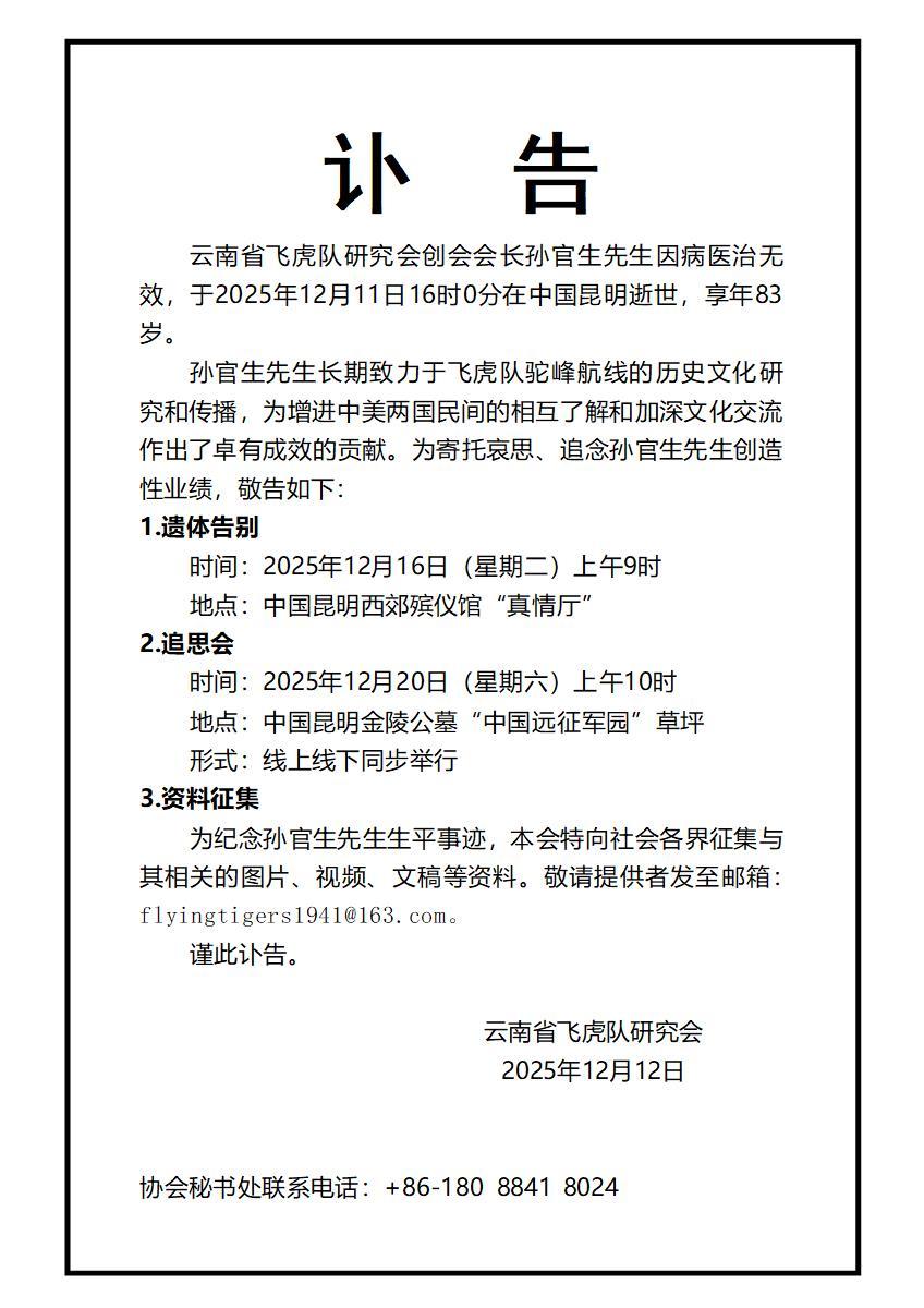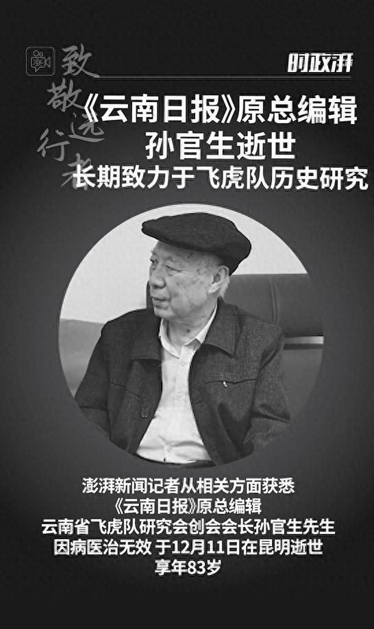 澎湃新闻记者从相关方面获悉,《云南日报》原总编辑、云南省飞虎队研究会创会会长孙官生先生,因病医治无效,于2025年12月11日在昆明逝世,享年83岁。