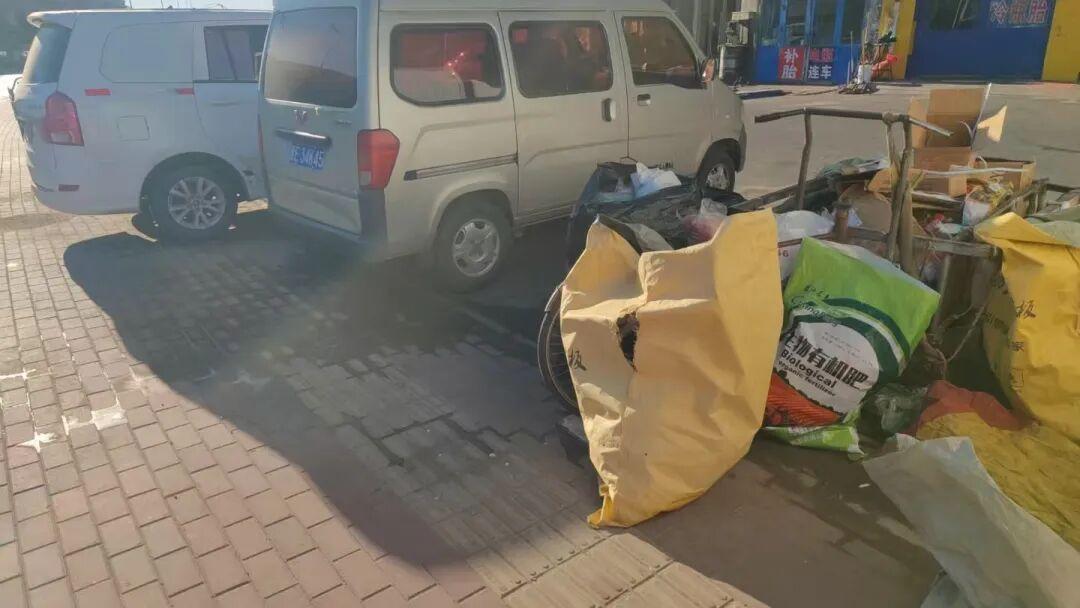 在一家修配店对面,一辆白色轿车和一辆厢货车停在盲道上;不远处,一个垃圾箱固定在盲道上;再往前,还有三轮车、纸箱等杂物占用盲道。