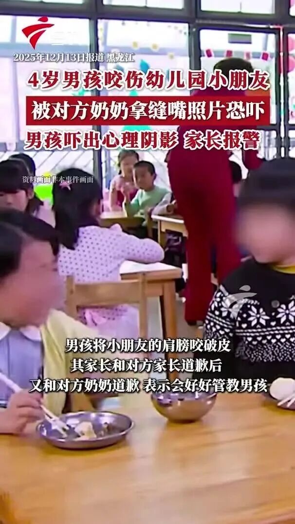 近日,黑龙江大庆,4岁男孩将幼儿园小朋友的肩膀咬破了皮,家长孙林(化名)得知后,和被咬伤孩子家长取得联系并道歉。当日下午接孩子时,孙林见到被咬伤孩子的奶奶李秀兰(化名),又道了歉,并表示会好好管教孩子。