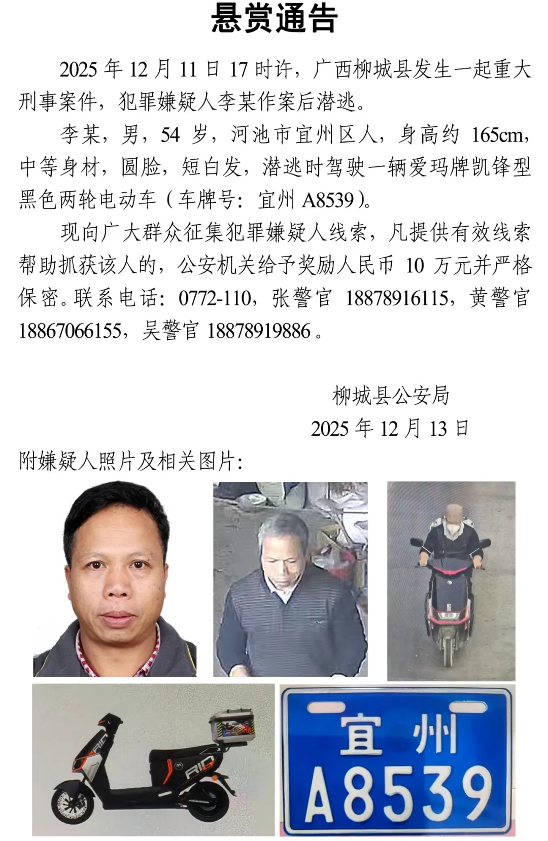 同日,公安局发布悬赏通告:李某,男,54 岁,河池市宜州区人,身高约165cm,中等身材,圆脸,短白发,潜逃时驾驶一辆爱玛牌凯锋型黑色两轮电动车(车牌号:宜州A8539)。