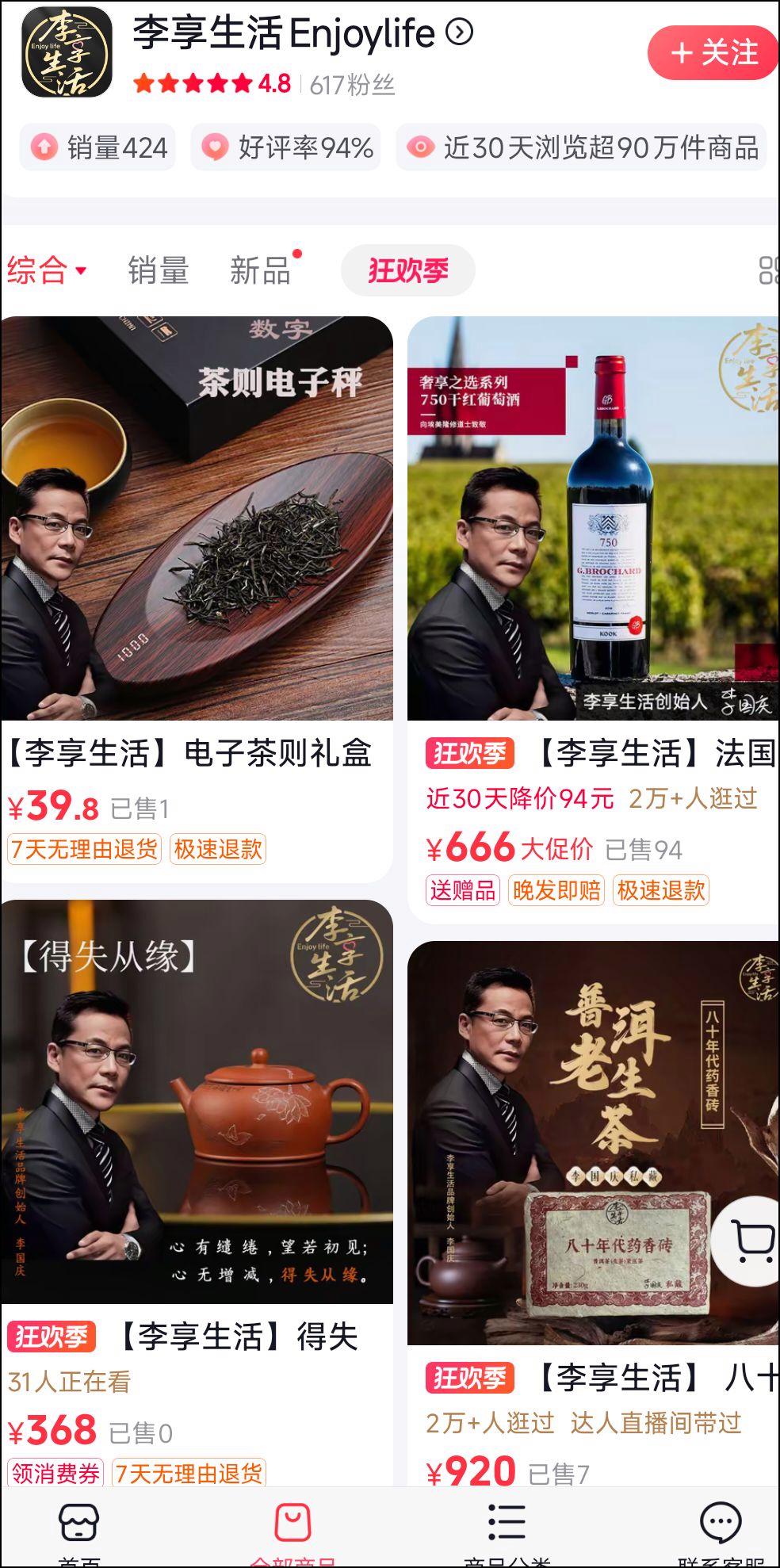 12月16日,记者注意到,“李享生活”抖音店铺已陆续上架紫砂壶、红酒、普洱茶等多款商品,累计销量达424件。其中销量领先的商品均为红酒类,定价区间在360元至1399元之间。初步估算显示,在尚未开展直播带货的情况下,该店铺销售额已接近24万元。