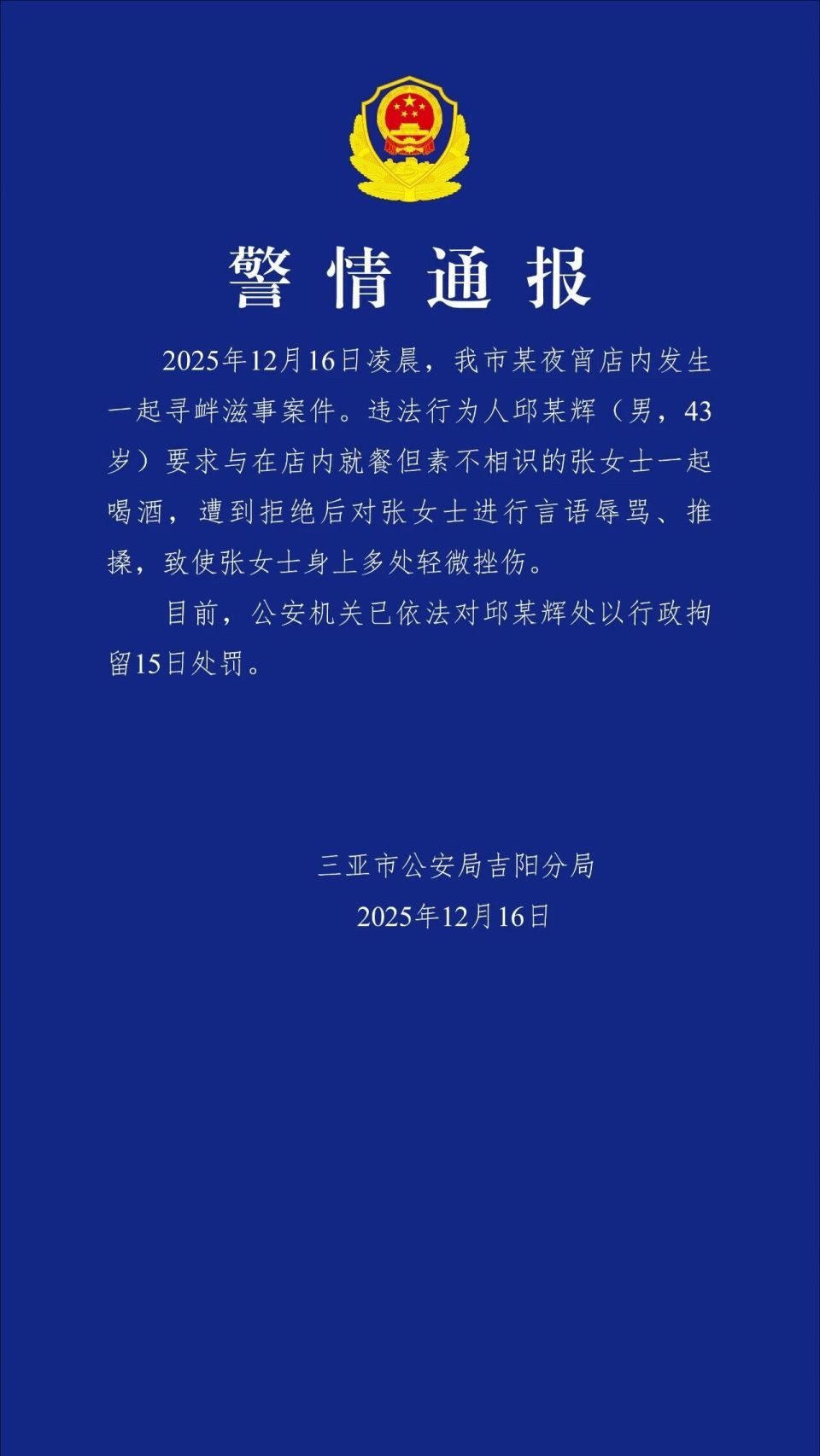 女子称拒绝陌生男子搭讪遭殴打,三亚警方通报:已对违法行为人邱某辉行拘15日