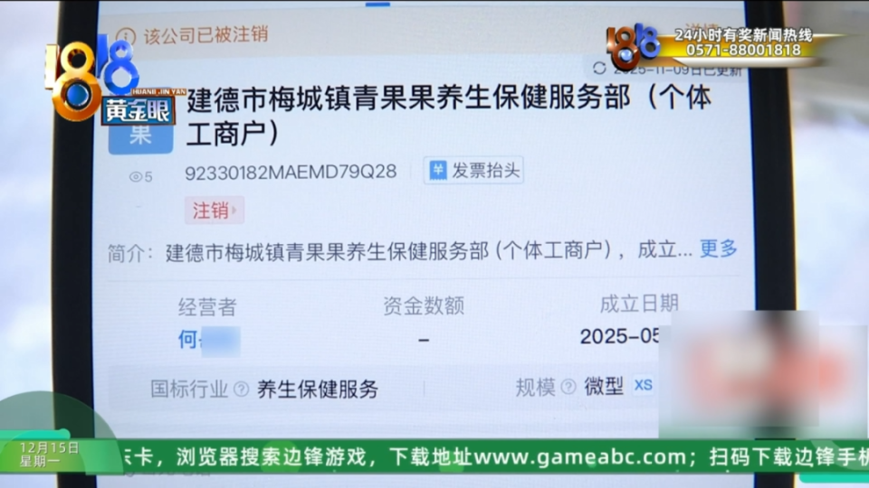 记者查询后发现建德市梅城镇青果果养生保健服务部经营者是一位何老板,但营业执照已经被注销掉了。