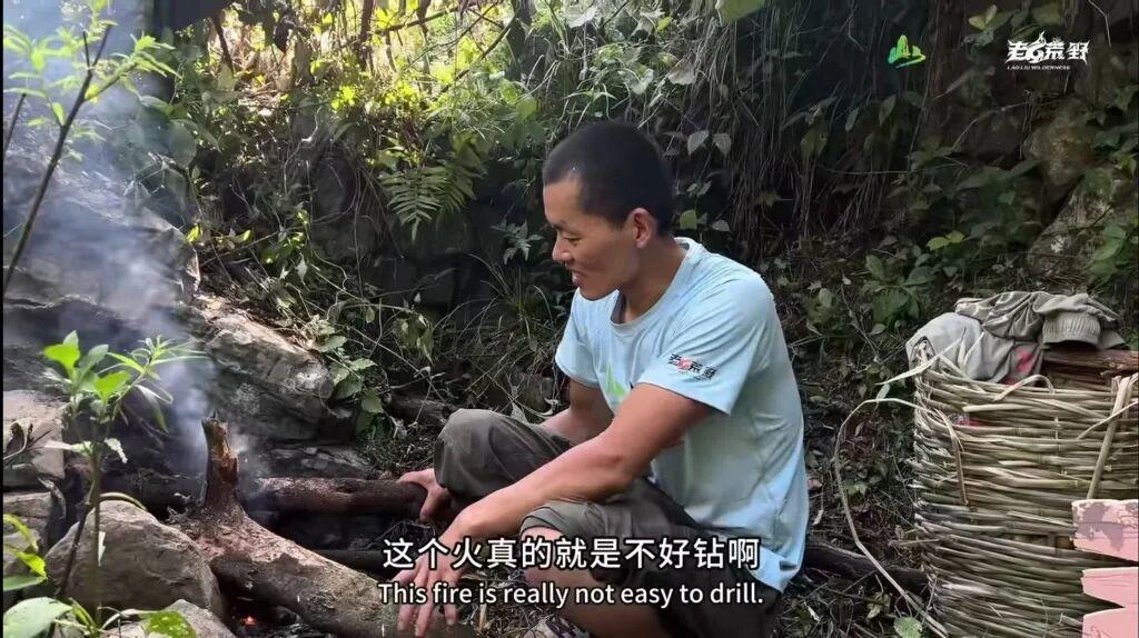为了钻木取火,我找来一根棍子,绑上一条绳子,带动另一根棍子快速旋转摩擦,下面的木板和草屑就会冒烟、起火,但想要取火成功,这些草屑必须保持干燥。来参赛之前,我在家里练习过几次钻木取火,很容易成功。但比赛时山上下雨,木材湿漉漉的,我于是把杂草、木材放在身上,用体温把它烘干,到了第15天,天气变晴,我才终于取火成功。