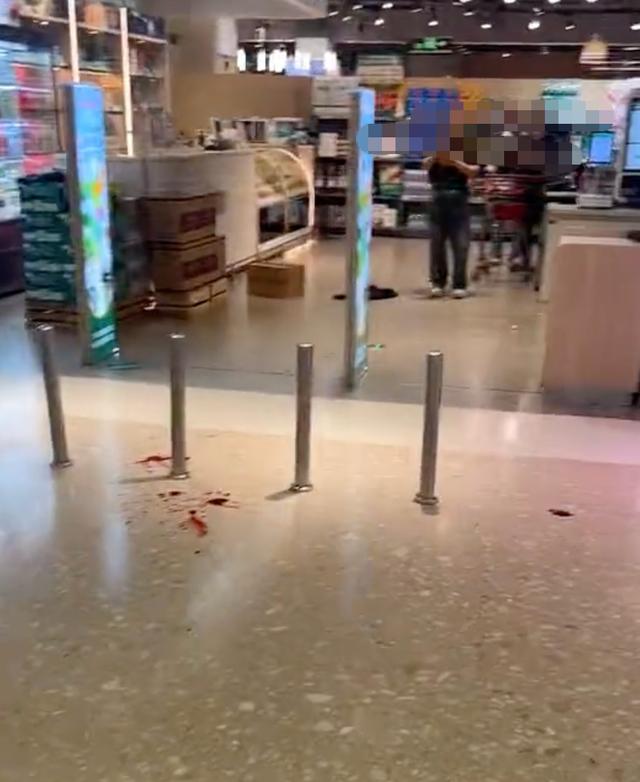 现场视频显示,一男子身穿黑衣、头戴黑色鸭舌帽,戴着黑色口罩走在商场地下一层的走廊内,目击者指称其为伤人者,男子行进路线前方的市民仓皇逃离。视频中拍到,一超市门口地面有血迹。