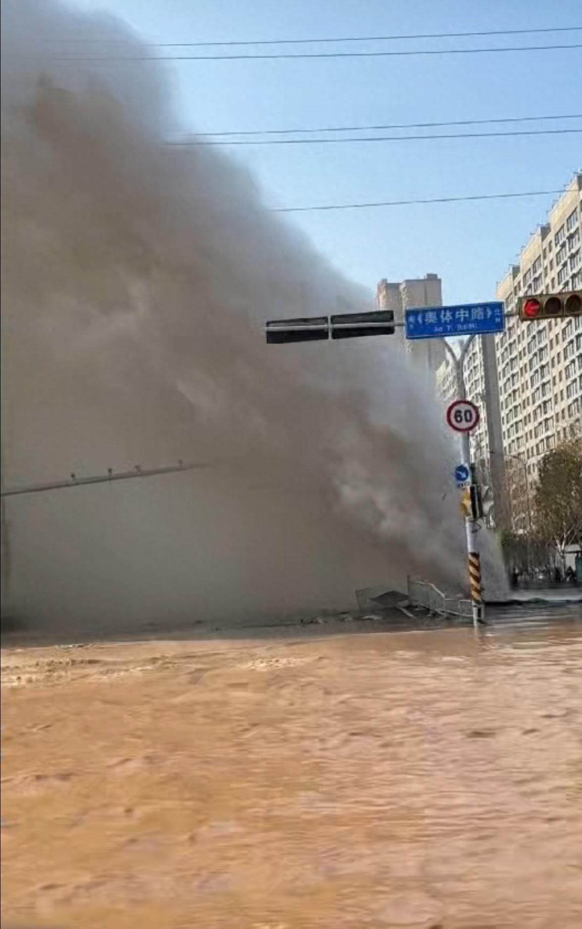 视频里,有清晰的路牌显示为“奥体中路”,路牌旁边是红绿灯,爆管的位置就在红绿灯附近,大量的水从管道里喷涌出来,足有数米高。