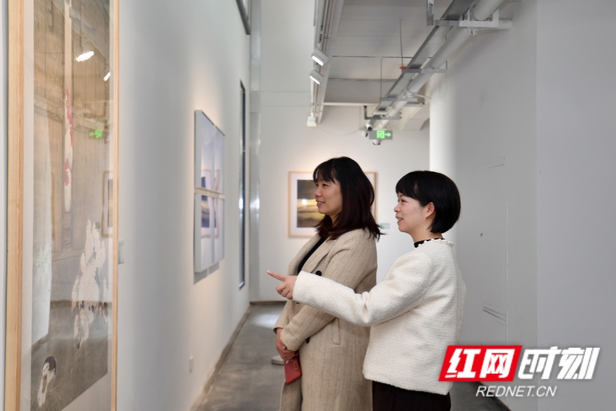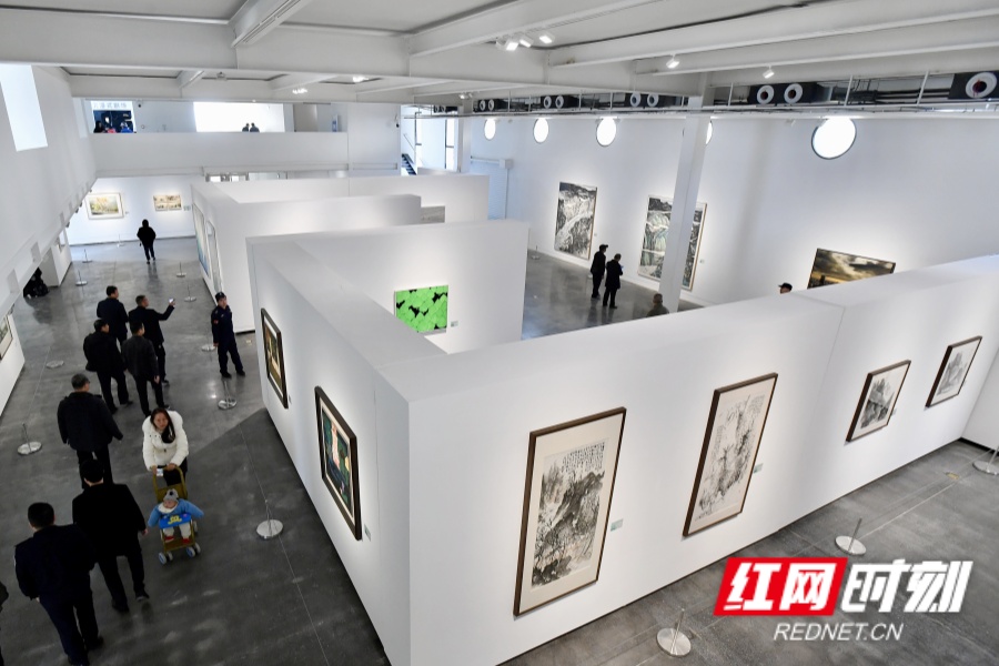 当天,“潇湘万象——湖南美术名家邀请展”同步开展。展览分为“意写山河”“工致雅韵”“彩绘诗境”“水色澄心”四大板块,集中展出了黄铁山、朱训德、刘云、旷小津、王金石等20余位湖南代表性艺术家的50余件精品力作,涵盖中国画、工笔画、油画、水彩画等门类。