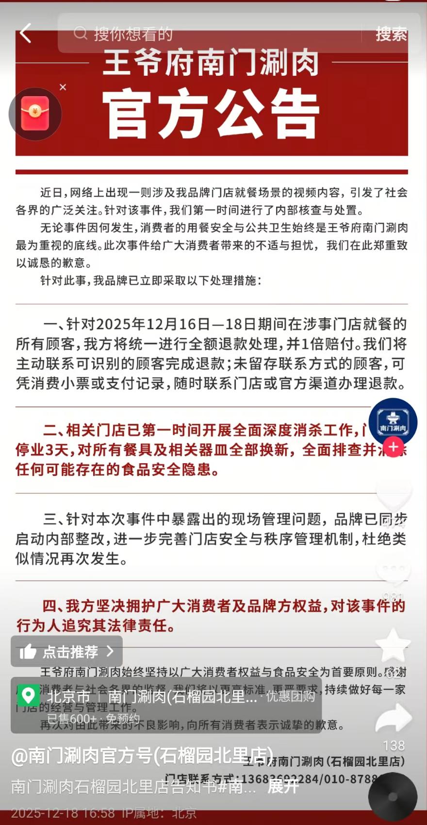 据纵览新闻报道,12月18日下午,涉事餐厅王爷府南门涮肉北京某店负责人向记者表示,事件发生于12月16日晚,目前该店已停业整顿,并对当日所有就餐顾客退款且一倍赔付,同时将追究该事件行为人的法律责任。
