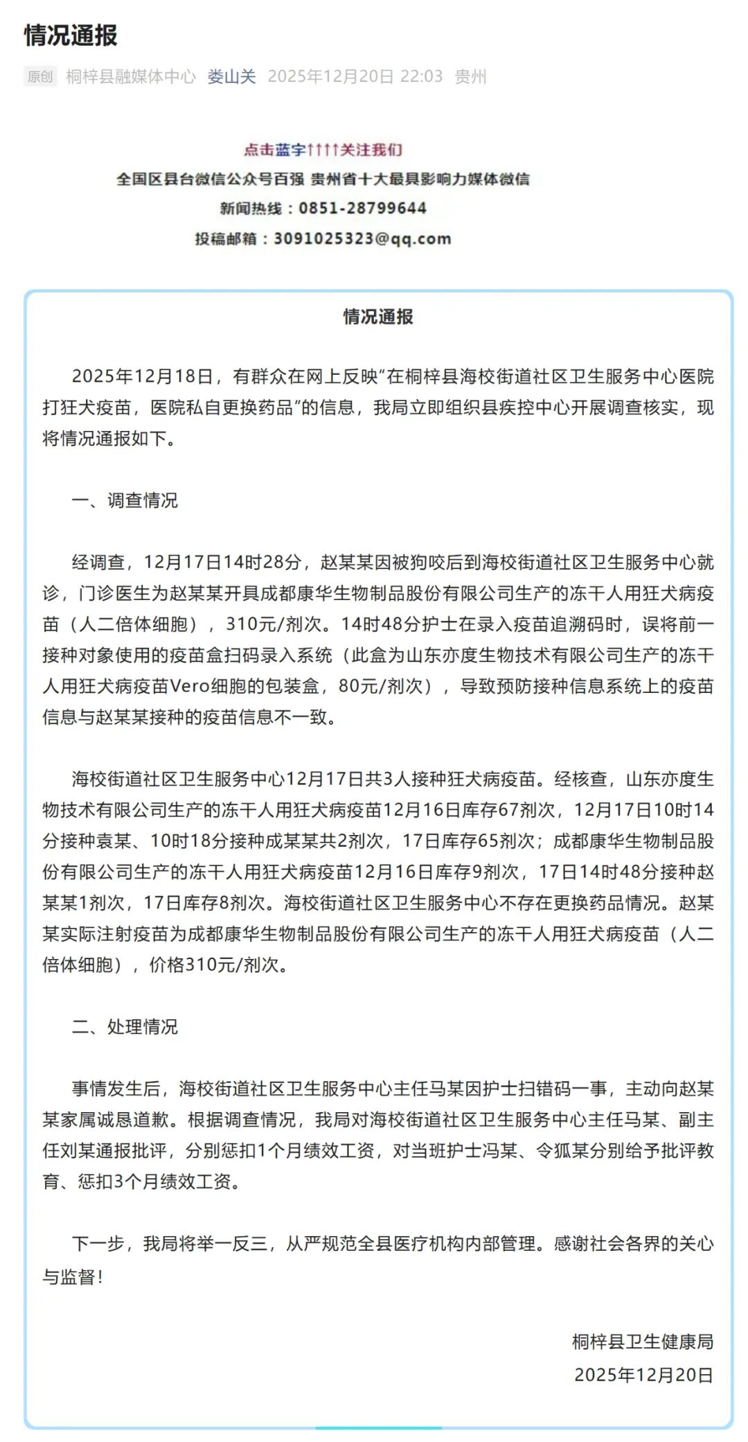 贵州省桐梓县卫生健康局12月20日发布情况通报:2025年12月18日,有群众在网上反映“在桐梓县海校街道社区卫生服务中心医院打狂犬疫苗,医院私自更换药品”的信息,我局立即组织县疾控中心开展调查核实,现将情况通报如下。