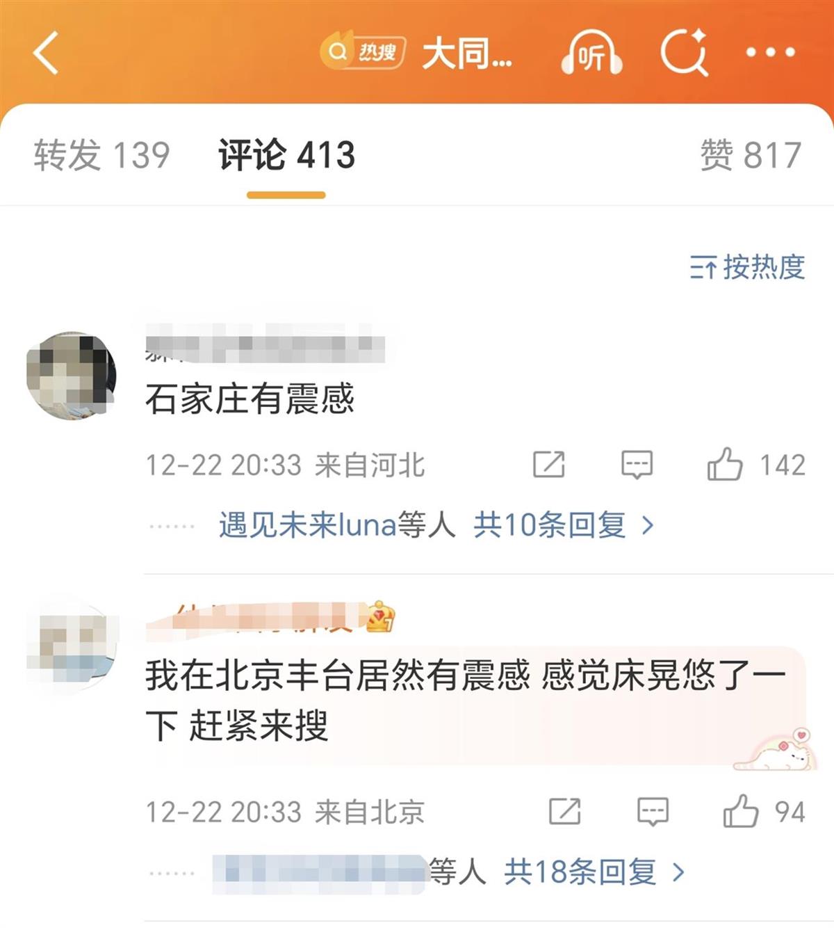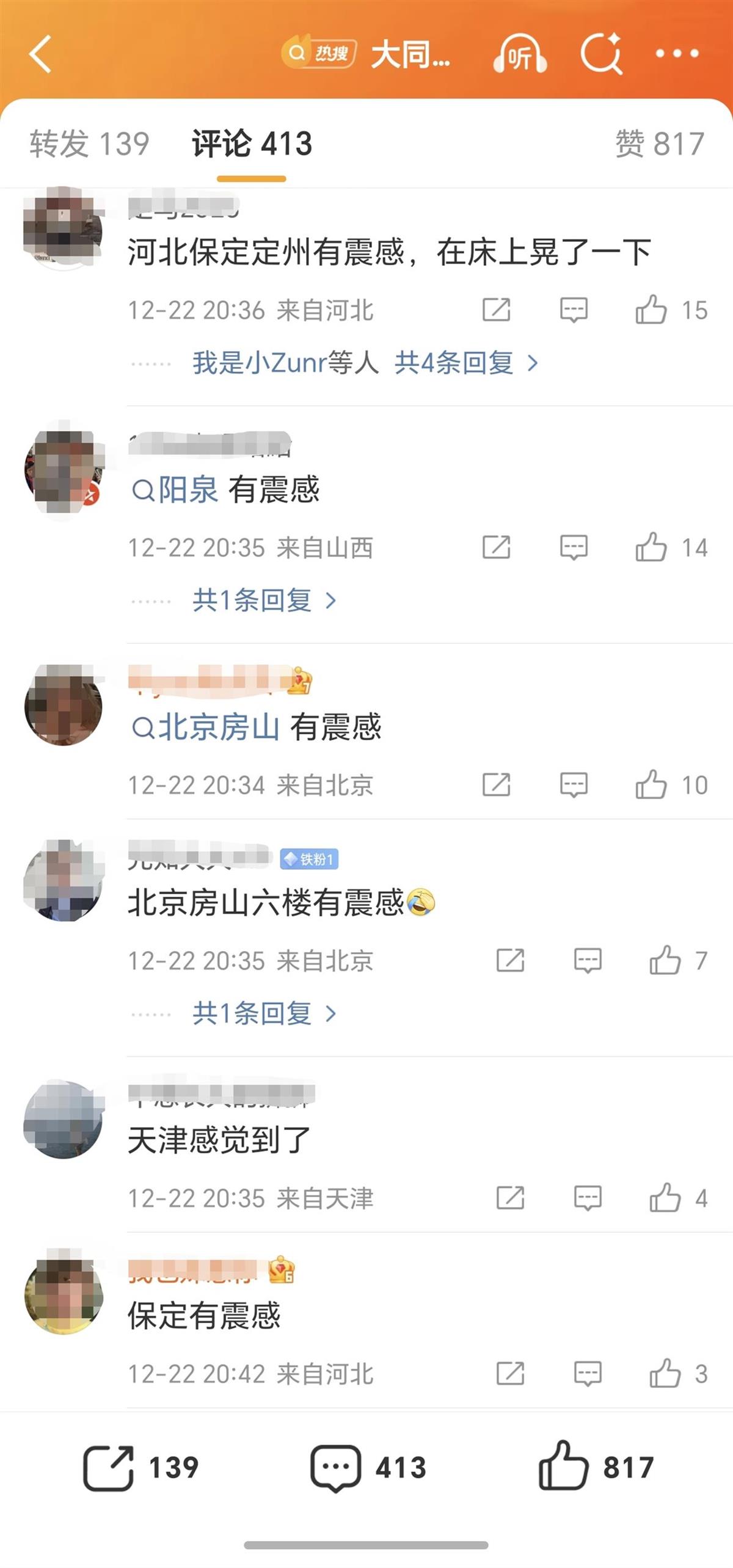 极目新闻记者注意到,在中国地震台网官方微博评论区,有来自北京、河北、天津的不少网友称有明显震感。一名来自河北保定的网友表示,河北保定震感较强,“在床上晃了一下”,另一名来自北京房山的网友称,他在6楼感觉到了震感,此外河北石家庄、北京通州、顺义、丰台等地的网友也纷纷表示感觉到了地震。